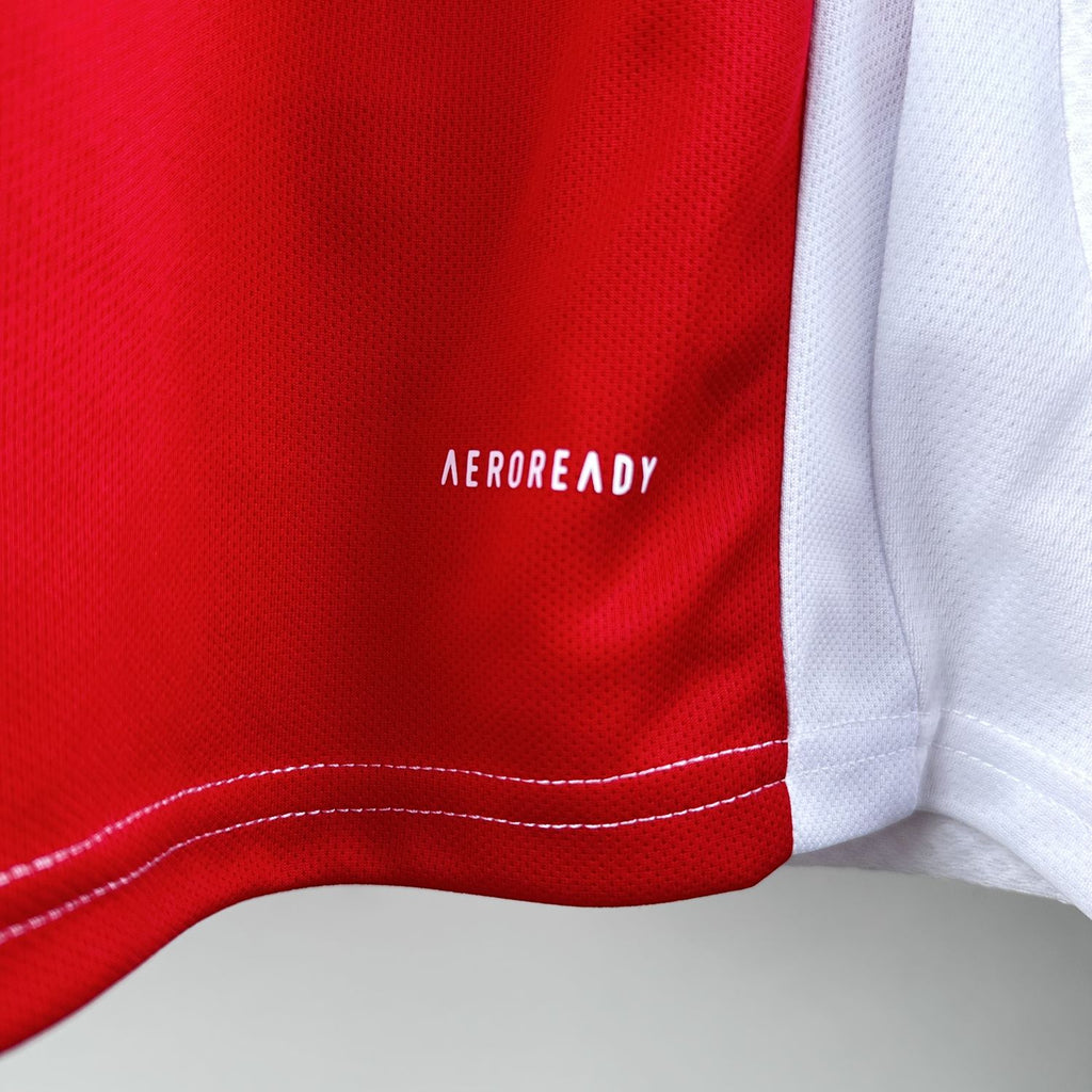 Na nuca, as três cruzes de Santo André, símbolo de Amsterdã, reforçam o vínculo com a cidade. O escudo do Ajax com as estrelas douradas aparece no peito esquerdo, enquanto o logotipo da Adidas está no lado direito. O uniforme é completado com calção e meiões brancos com detalhes em vermelho, e a versão feminina do manto é destacada por trazer o logo da ABN-AMRO, patrocinador da era dourada do clube nos anos 1990.