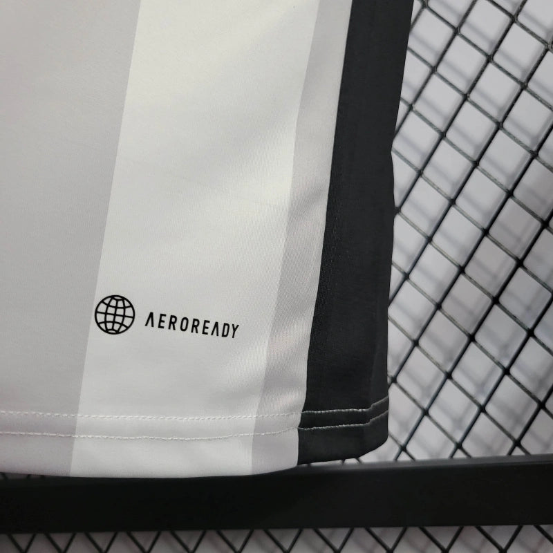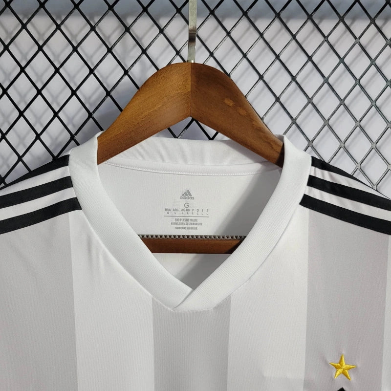 A Camisa 2 do Atlético Mineiro temporada 2022/23, apresenta um design elegante com listras verticais em branco e cinza claro, complementadas por detalhes em preto nos ombros e mangas. O escudo do clube está bordado no peito, ao lado do logotipo da Adidas, e inclui os patrocinadores oficiais na frente e nas costas. Confeccionada em poliéster de alta qualidade, a camisa utiliza a tecnologia Aeroready, que auxilia na absorção do suor, proporcionando conforto tanto dentro quanto fora dos campos.