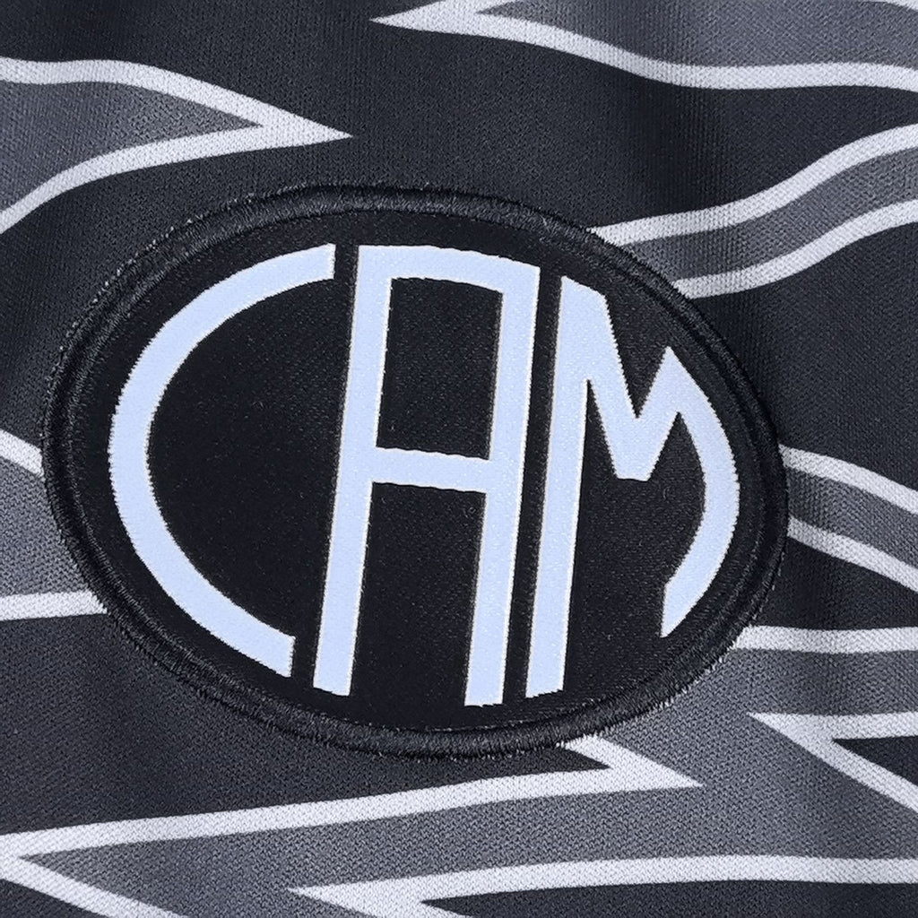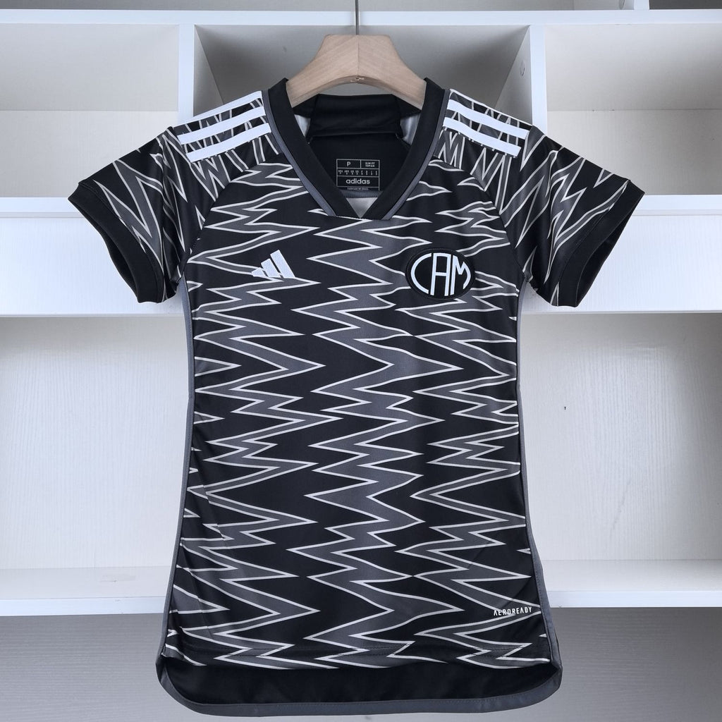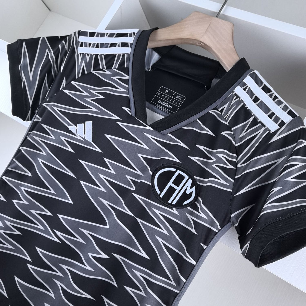 A terceira camisa exibe uma combinação de cores que foge ao tradicional preto e branco do Galo, adotando um tom alternativo e chamativo, usualmente em preto com detalhes dourados ou em outra paleta diferenciada que se destaca tanto nos estádios quanto no uso casual. O escudo do Atlético Mineiro e o logo da marca fornecedora aparecem em relevo no peito, com detalhes bem trabalhados para um acabamento de alta qualidade.