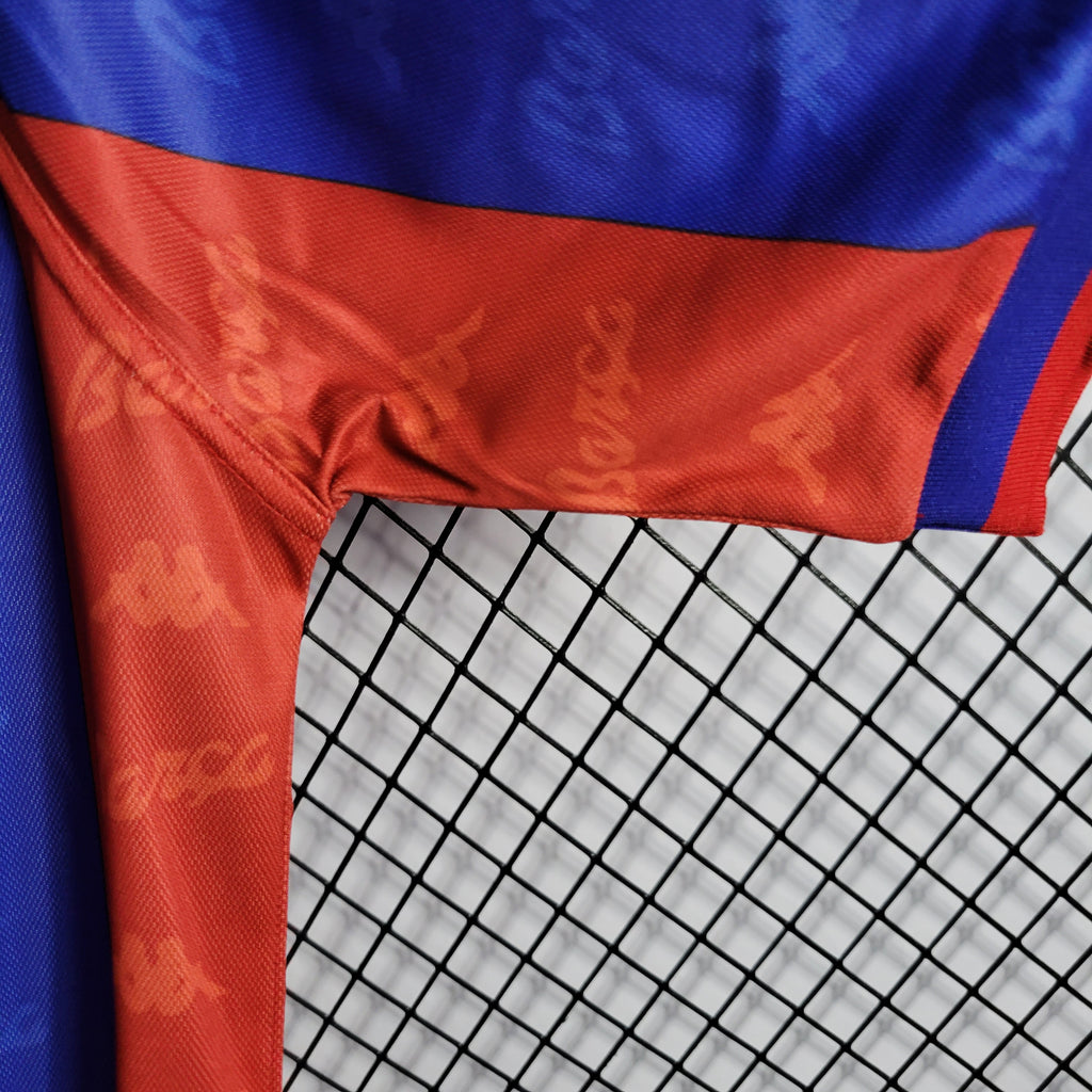A camisa titular do FC Barcelona da temporada 1996/1997, produzida pela Kappa, é um ícone entre os colecionadores e fãs do clube. Este uniforme apresenta as tradicionais listras verticais em azul e grená, cores emblemáticas do Barça. O design inclui uma gola polo azul com detalhes em vermelho, e as mangas são adornadas com o logotipo da Kappa repetido ao longo dos ombros. O escudo do FC Barcelona está bordado no lado esquerdo do peito, enquanto o logotipo da Kappa aparece no lado direito.
