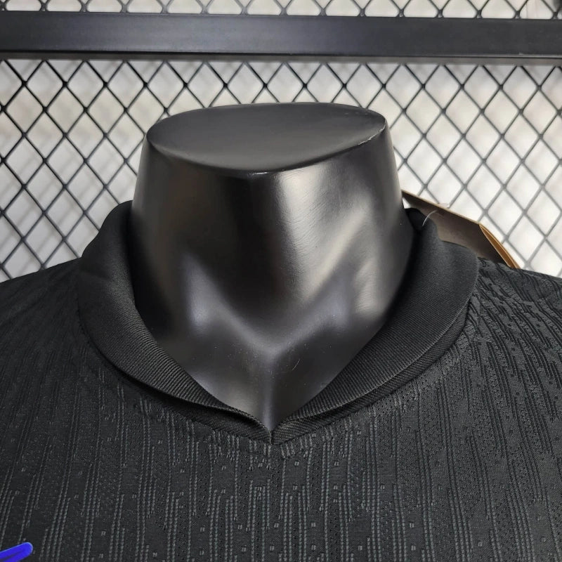 A segunda camisa do FC Barcelona para a temporada 2024/25 apresenta um design moderno e elegante. Predominantemente preta, ela incorpora detalhes em azul e grená, cores tradicionais do clube, proporcionando um contraste sofisticado. O escudo do Barcelona e o logotipo da Nike estão presentes no peito, enquanto o patrocinador principal, Spotify, aparece em destaque na parte frontal.