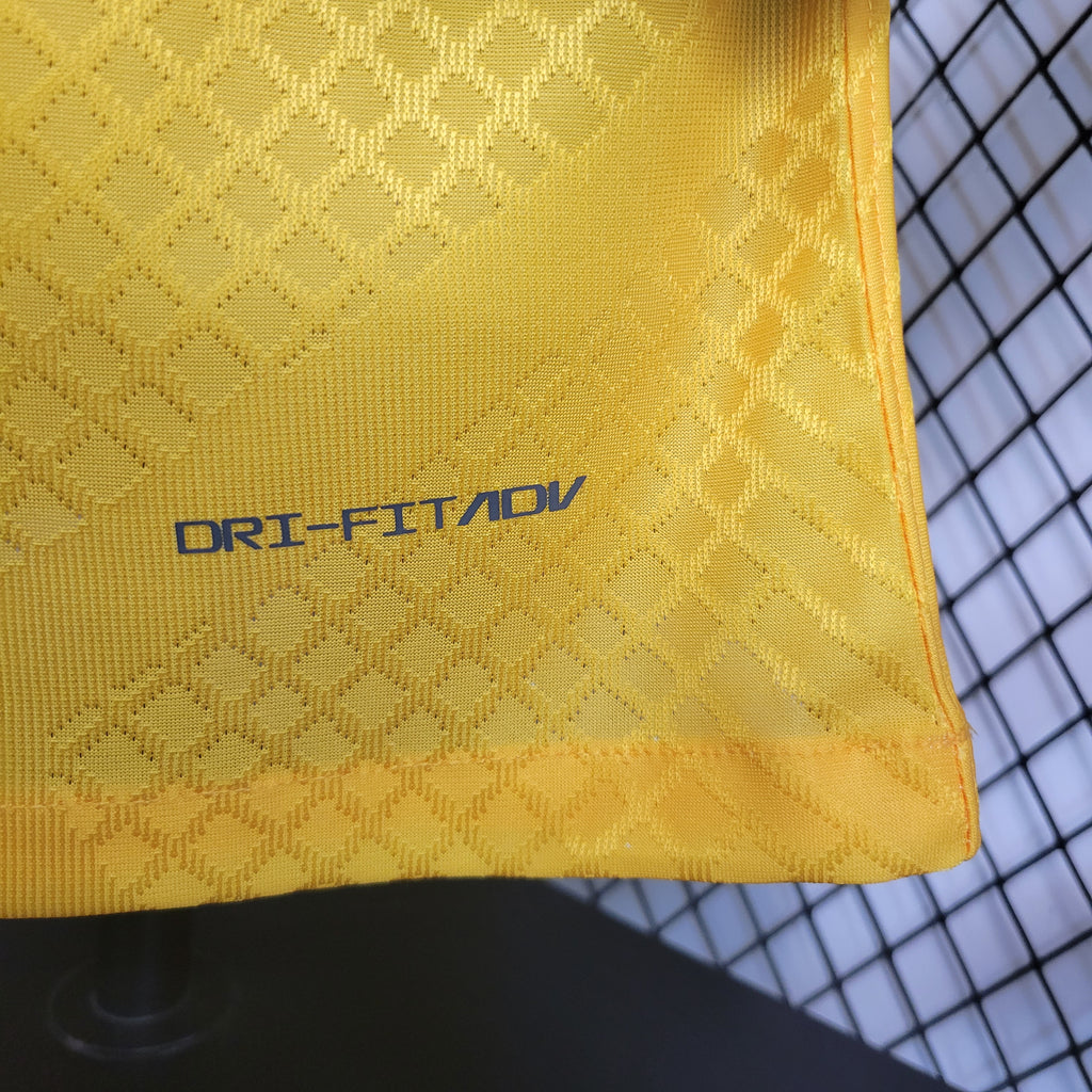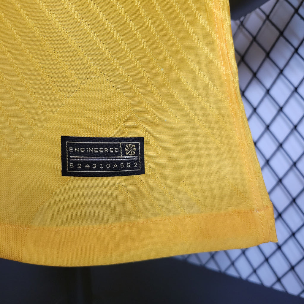 A quarta camisa do FC Barcelona para a temporada 2024/25 presta homenagem à bandeira da Catalunha, conhecida como "Senyera". O design apresenta uma base amarela com quatro faixas horizontais vermelhas no peito, simbolizando as quatro listras da bandeira catalã. O logotipo da Nike está posicionado na manga, conferindo um toque diferenciado ao uniforme.