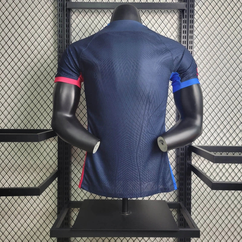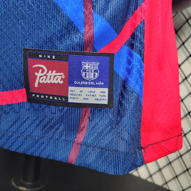 A edição especial da camisa do FC Barcelona para 2024 apresenta um design arrojado e moderno, mantendo as tradicionais cores azul e grená com um toque inovador. O padrão gráfico com linhas curvas e dinâmicas simboliza a conexão global do clube e a sua presença internacional, destacando a parceria com o patrocinador "Spotify".