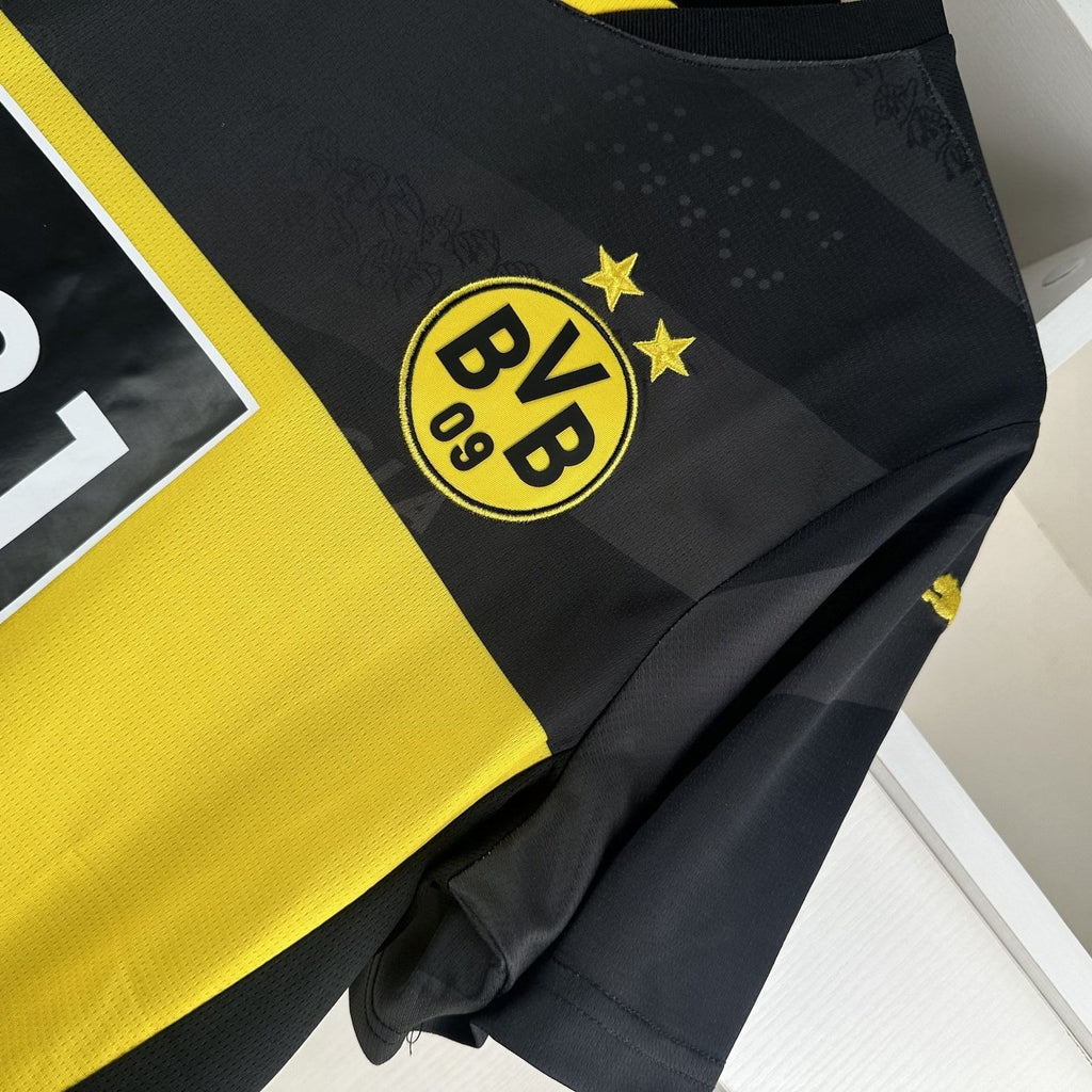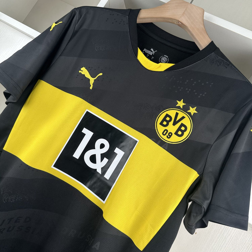 A camisa 2 do Borussia Dortmund para a temporada 2024/25, desenhada pela PUMA, tem um visual predominantemente preto com detalhes significativos em amarelo, celebrando diversidade e inclusão entre os fãs do clube. O lema "United by Borussia" (Unidos pelo Borussia) é um elemento central, aparecendo em diferentes formas na camisa, incluindo letras, linguagem de sinais e Braille, uma escolha que busca tornar o design acessível e inclusivo para todos os torcedores, incluindo os com deficiências visuais. O escudo do clube e o logotipo da PUMA são amarelos, contrastando com o fundo preto, enquanto o detalhe das listras tonais pretas adiciona um toque moderno e elegante ao uniforme.