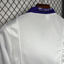 A camisa retrô do Real Madrid da temporada 1997/98 é uma peça icônica que remete a um período de grandes conquistas do clube, incluindo a vitória na Liga dos Campeões da UEFA. Fabricada pela Kelme, a camisa apresenta um design clássico predominantemente branco, com detalhes em azul, incluindo a gola em "V" e os ombros. O logotipo do patrocinador "Teka" está estampado na frente, e o escudo do clube está centralizado no peito.