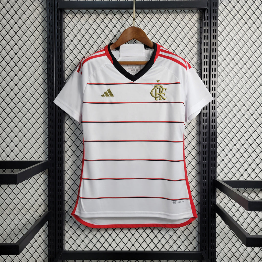 A Camisa 2 do Flamengo 2023/2024, desenvolvida pela Adidas, destaca-se pelo design clássico e elegante. Predominantemente branca, a camisa apresenta finas listras horizontais em vermelho e preto, mantendo a tradição rubro-negra. O escudo do clube e o logotipo da Adidas são bordados em dourado, conferindo um toque de sofisticação ao manto. Confeccionada com a tecnologia AEROREADY, a peça proporciona excelente absorção de suor, garantindo conforto tanto para torcedores quanto para atletas.