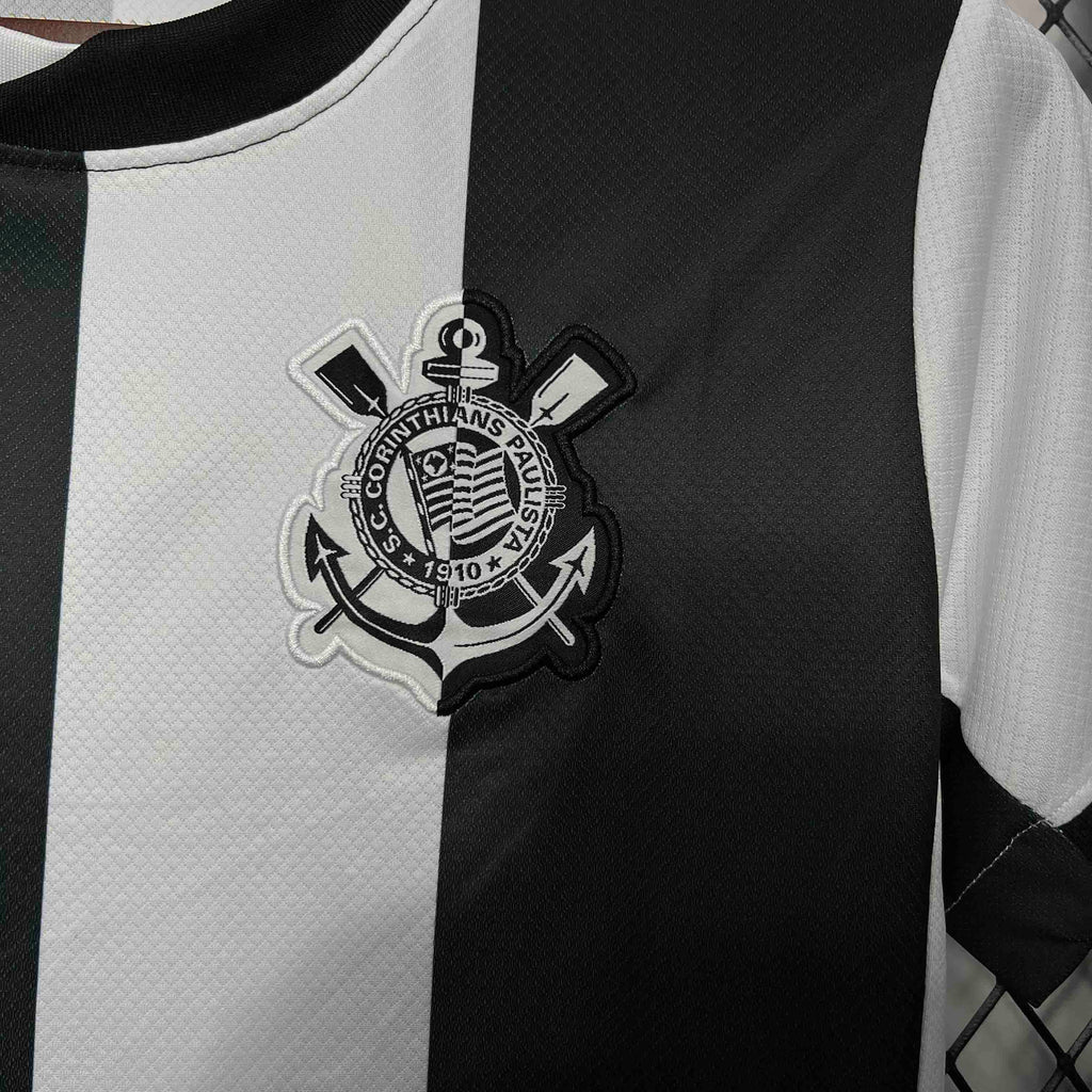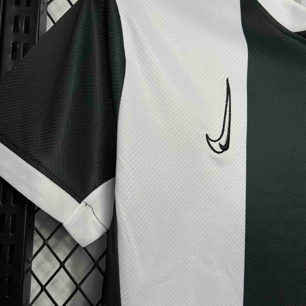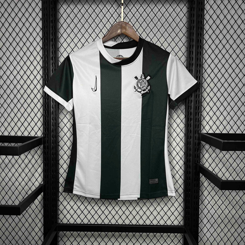A Camisa Nike Corinthians III 2024/25 Torcedora Pro Feminina celebra a união e o crescimento do futebol feminino e masculino do S.C. Corinthians. O design apresenta listras verticais em preto e branco, simbolizando a tradição do clube. O destaque fica por conta do duplo logotipo Swoosh da Nike, representando a parceria entre as equipes masculina e feminina e apontando para cima em referência à ascensão do futebol feminino.