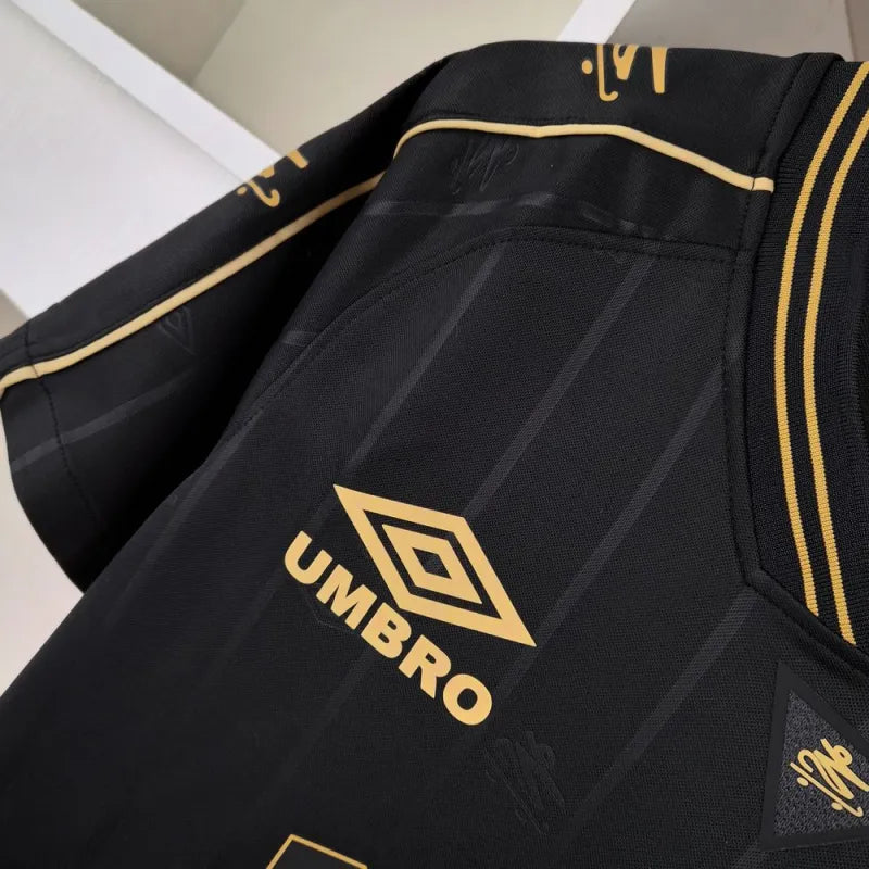A camisa do Santos em parceria com o Charlie Brown Jr. para 2024 é uma celebração à icônica banda santista. Inspirada na música "Vícios e Virtudes", a camisa apresenta um design moderno com as cores preta e dourada, simbolizando a energia e atitude do rock nacional. Esta edição especial homenageia os 30 anos do álbum que marcou gerações, incorporando elementos visuais e frases da banda.