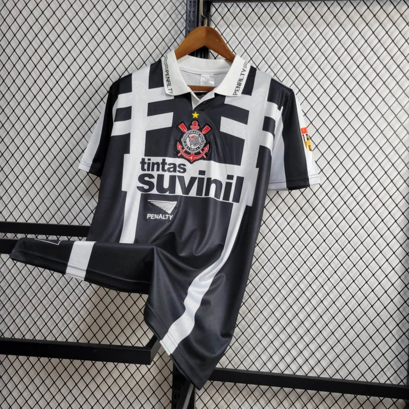 A Camisa 2 Retrô do Corinthians de 1995 é uma peça emblemática para os torcedores, remetendo ao período em que o clube conquistou a Copa do Brasil. Este modelo, tradicionalmente utilizado como uniforme reserva, destaca-se pelas listras verticais em preto e branco e pelo patrocínio da Suvinil estampado no peito.