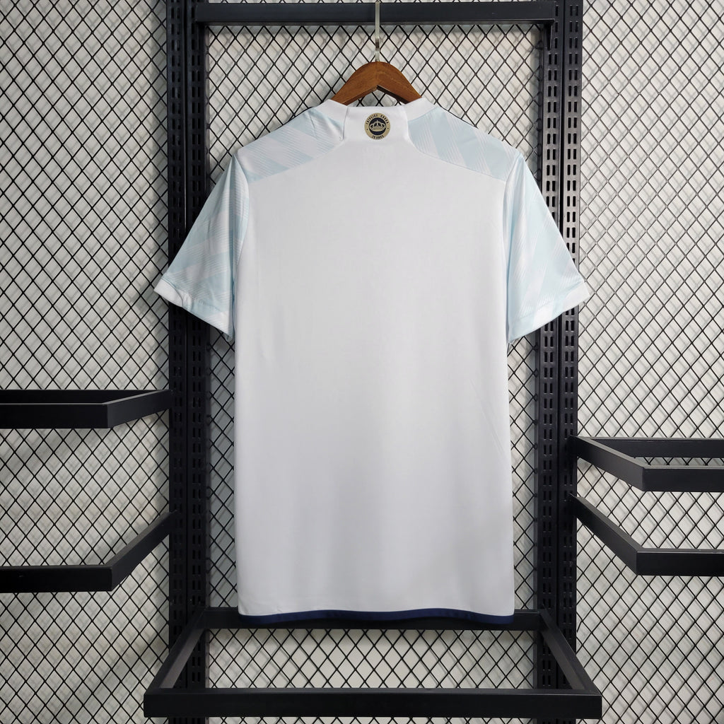 A Camisa 2 do Cruzeiro para a temporada 2023/24, produzida pela Adidas, presta homenagem aos 20 anos da conquista da Tríplice Coroa em 2003. O design predominante em branco apresenta listras diagonais em azul claro e gola em V. Um detalhe marcante é a disposição das estrelas soltas em azul, remetendo ao uniforme histórico daquela temporada vitoriosa.