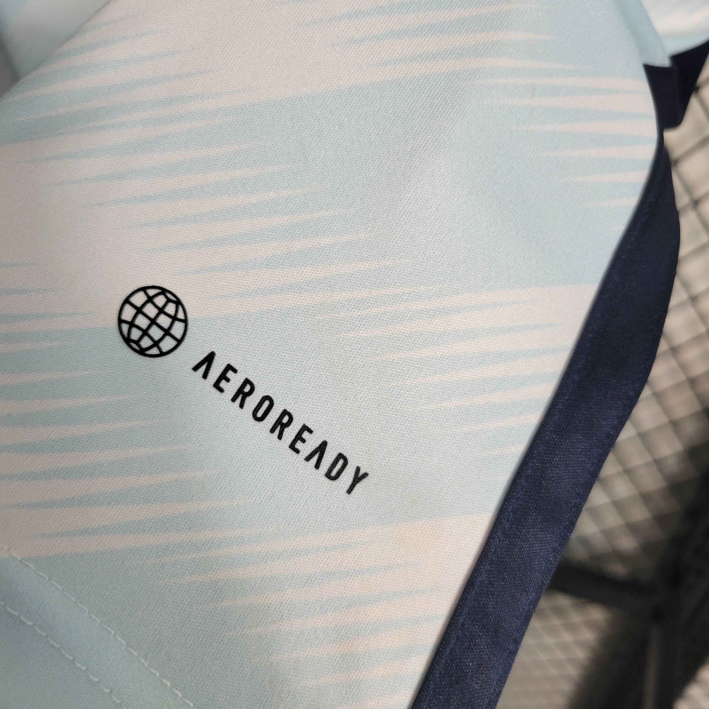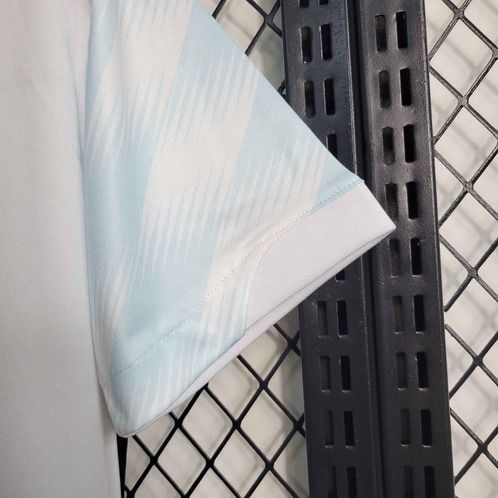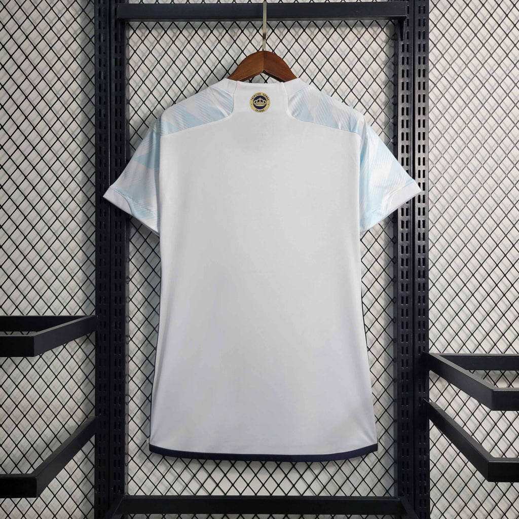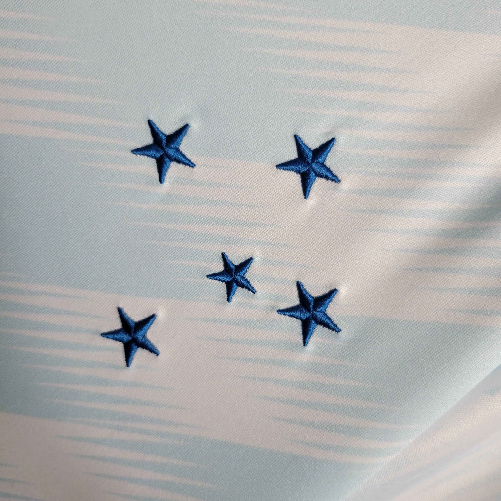 A Camisa 2 do Cruzeiro para a temporada 2023/24, modelo feminino, foi desenvolvida pela Adidas em homenagem aos 20 anos da conquista da Tríplice Coroa. Este manto reserva apresenta design predominantemente branco, com detalhes em azul-marinho, incluindo gola em "V" e listras nas mangas. O destaque fica por conta das estrelas soltas bordadas, remetendo ao uniforme vitorioso de 2003. Além disso, a tecnologia AEROREADY do tecido garante absorção de suor, proporcionando conforto e pele seca durante o uso.