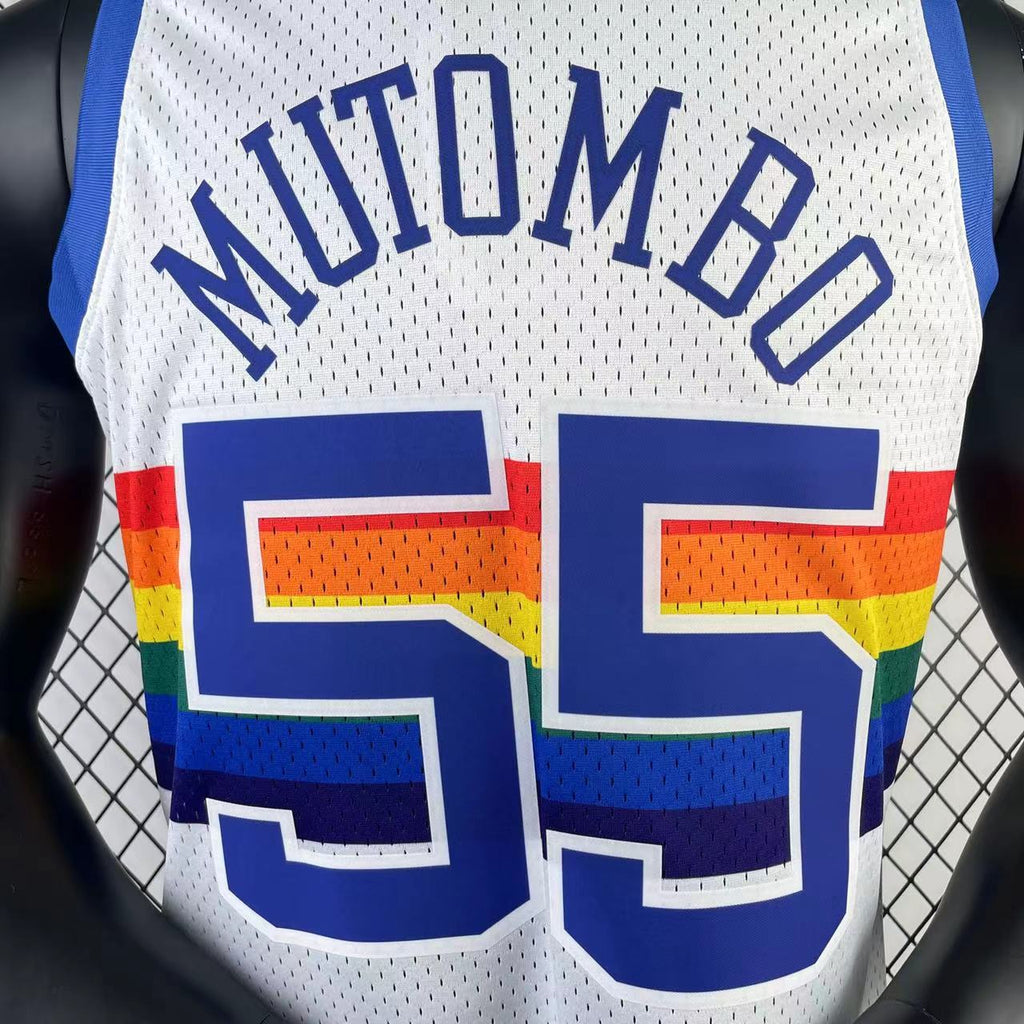 Dikembe Mutombo teve uma passagem marcante pelo Denver Nuggets na NBA. Ele foi selecionado como a quarta escolha geral no Draft de 1991 pelos Nuggets e rapidamente se estabeleceu como um dos melhores pivôs defensivos da liga. Mutombo era conhecido por sua impressionante envergadura e habilidade de bloquear arremessos, sendo um dos jogadores mais intimidadores da NBA em sua época. Ele dominou o garrafão defensivo dos Nuggets, contribuindo não apenas com sua defesa, mas também com sua capacidade de pegar rebotes e influenciar o jogo adversário. Durante sua passagem por Denver, Mutombo foi nomeado para várias seleções do All-Star Game e ganhou o prêmio de Defensor do Ano da NBA quatro vezes consecutivas (1995-1998). Sua presença foi crucial para os Nuggets, ajudando a equipe a ser competitiva na Conferência Oeste. Em homenagem a este grande atleta, a Mitchell & Ness eternizou a história de Dikembe Mutombo, nesta regata exclusiva. Não perca a chance de levar para casa um pedaço da história do basquete.