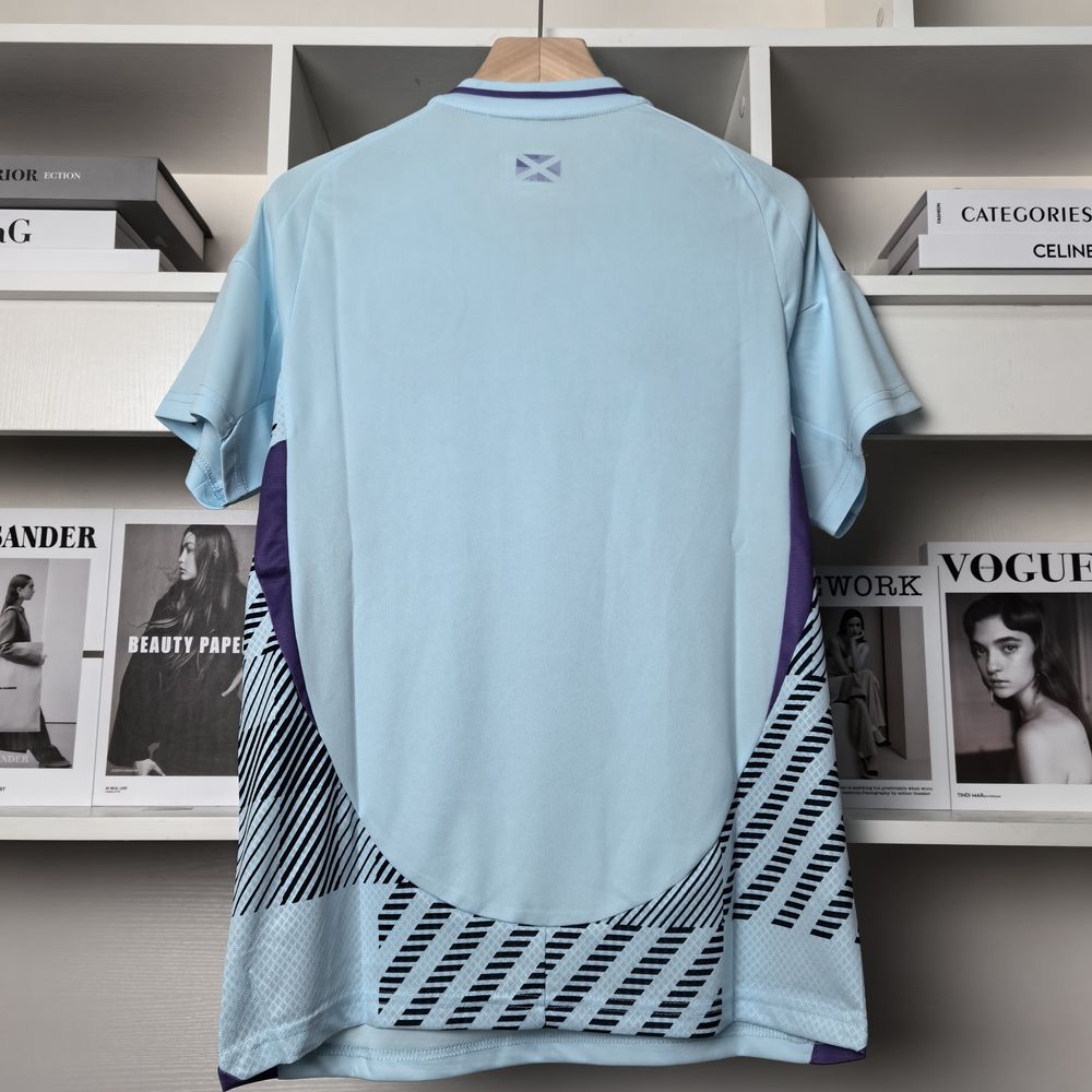 A camisa Away da Escócia para a temporada 24/25, produzida pela Adidas, é predominantemente azul menta com detalhes em azul marinho e branco. Feita de poliéster reciclado, a camisa utiliza a tecnologia AeroReady, que absorve o suor e mantém o corpo seco e confortável. O design moderno e fresco é inspirado nas paisagens serenas e nas cores vibrantes da Escócia1.