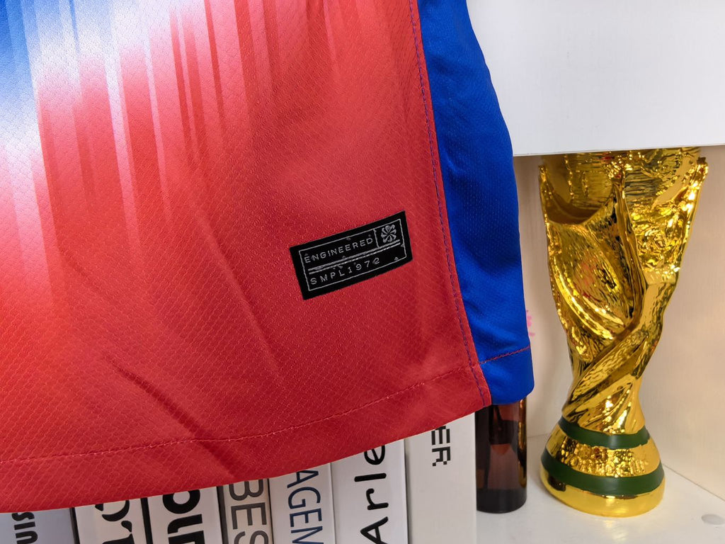 A camisa Away dos Estados Unidos para a temporada 24/25, produzida pela Nike, é predominantemente azul royal com uma faixa diagonal branca que se transforma em uma área vermelha. Este design é inspirado na seleção que disputou a Copa do Mundo de 1950, famosa por sua vitória histórica sobre a Inglaterra.