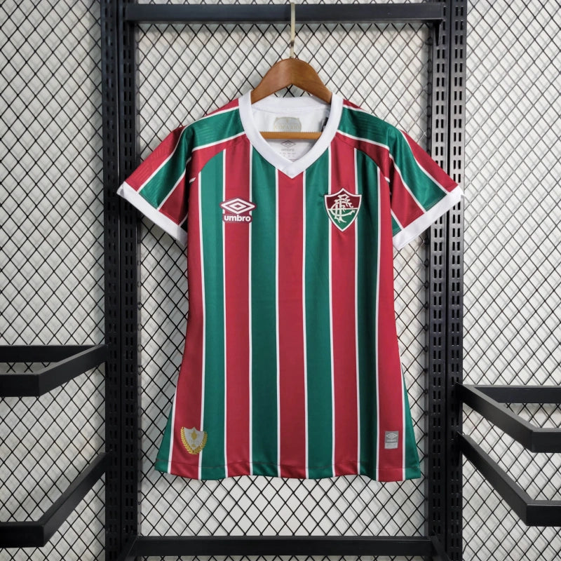 A Camisa 1 Fluminense Feminina 2023/24 é uma peça que celebra a tradição e a paixão das torcedoras pelo Tricolor Carioca. Este modelo apresenta as clássicas listras verticais em verde, grená e branco, cores emblemáticas do clube, reforçando a identidade e o orgulho de ser Fluminense.