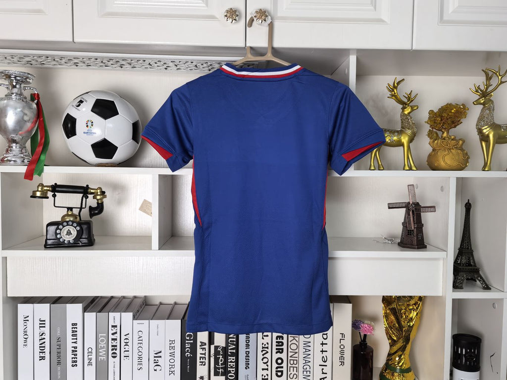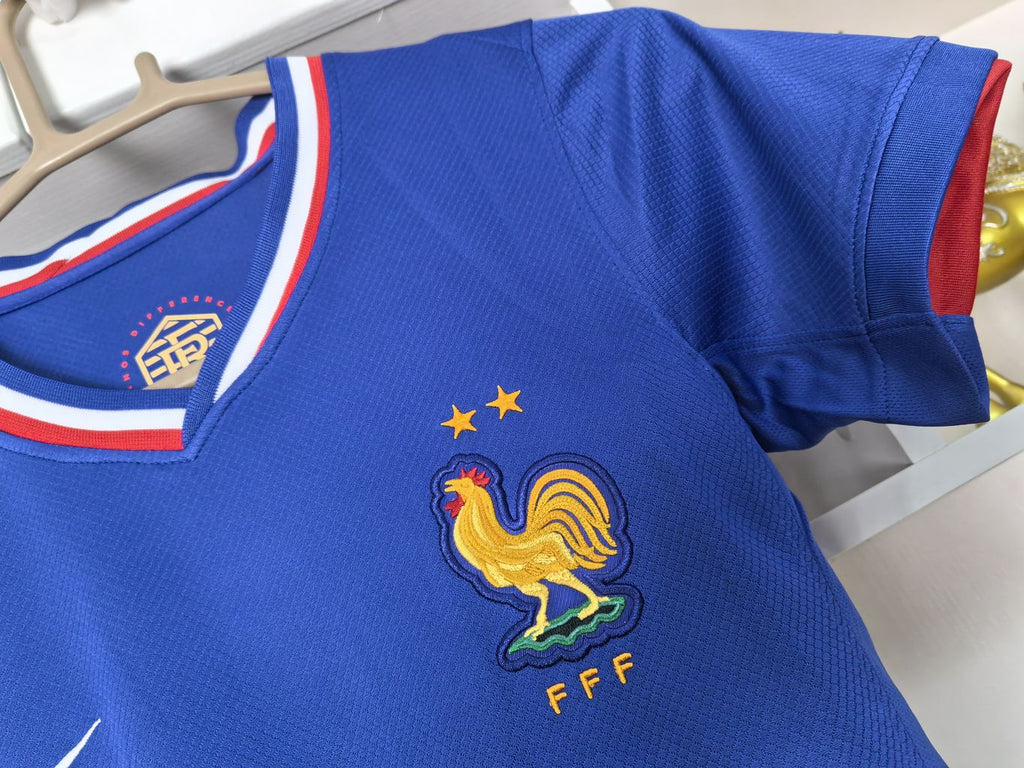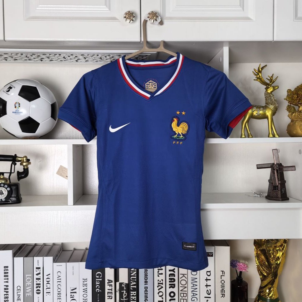 A camisa Home da França 24/25 Feminina da Nike celebra as pioneiras do futebol feminino na França. Ela apresenta um azul-claro icônico, com detalhes em azul-escuro no escudo e na parte superior da camisa, criando um contraste elegante. As mangas exibem as cores da bandeira francesa, adicionando um toque patriótico ao design.