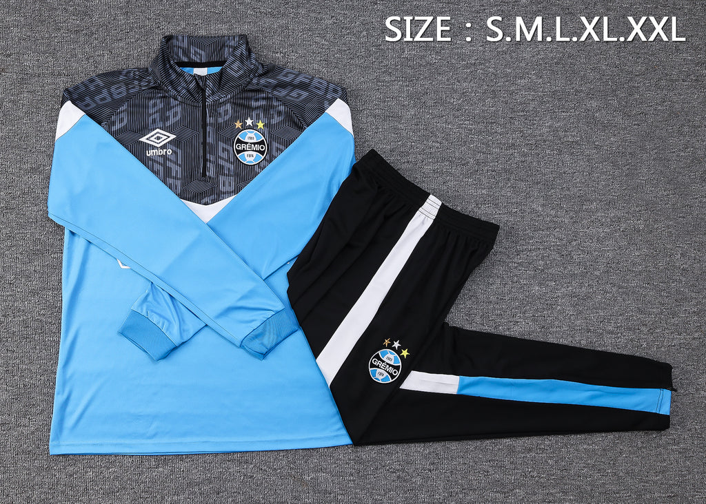 O design predominante em azul celebra as cores tradicionais do clube, com o escudo do Grêmio bordado no peito, destacando a identidade gremista. O corte ajustado oferece um visual moderno, e a jaqueta conta com Quarter ziper. A calça também é ajustável, com cintura elástica e bolsos. O conjunto é perfeito para quem quer treinar ou apoiar o clube com estilo e conforto.