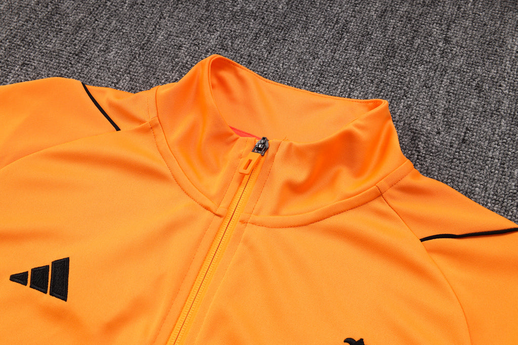 o Agasalho de Treino Internacional Laranja 2023 apresenta um design moderno com destaque para o conforto e estilo. Este fato de treino é feito para fãs do futebol, oferecendo mobilidade e ventilação ideais para treinos e atividades diárias. A combinação de tecidos respiráveis e detalhes elegantes faz com que seja tanto funcional quanto esteticamente agradável, com as icónicas três riscas da marca e a cor vibrante laranja a dar destaque.