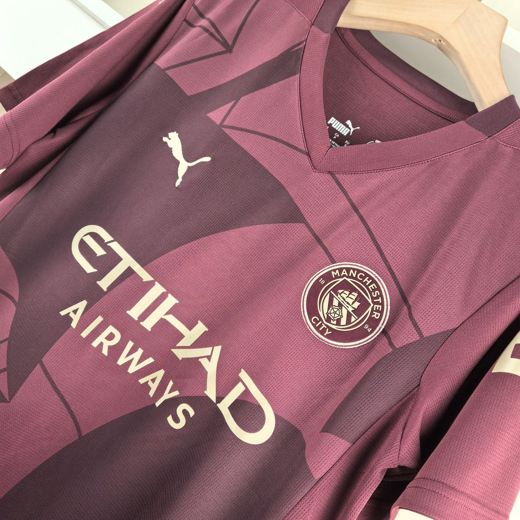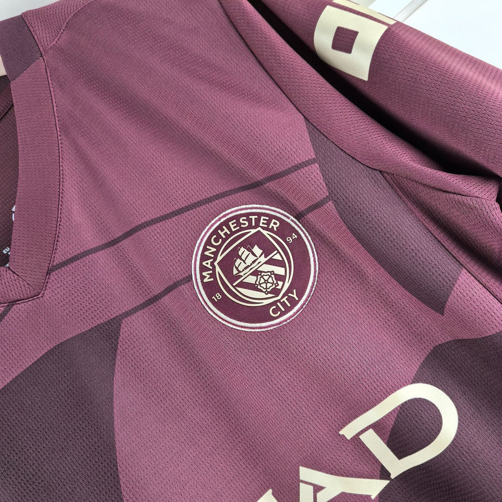 A nova terceira camisa do Manchester City para a temporada 2024/2025, desenvolvida pela Puma, destaca-se pela cor bordô clássica, complementada por detalhes dourados elegantes. Inspirada no constante movimento do clube, a camisa apresenta um design inovador que transforma o icônico navio do escudo em um gráfico tonal, representando o passado, presente e futuro do City.