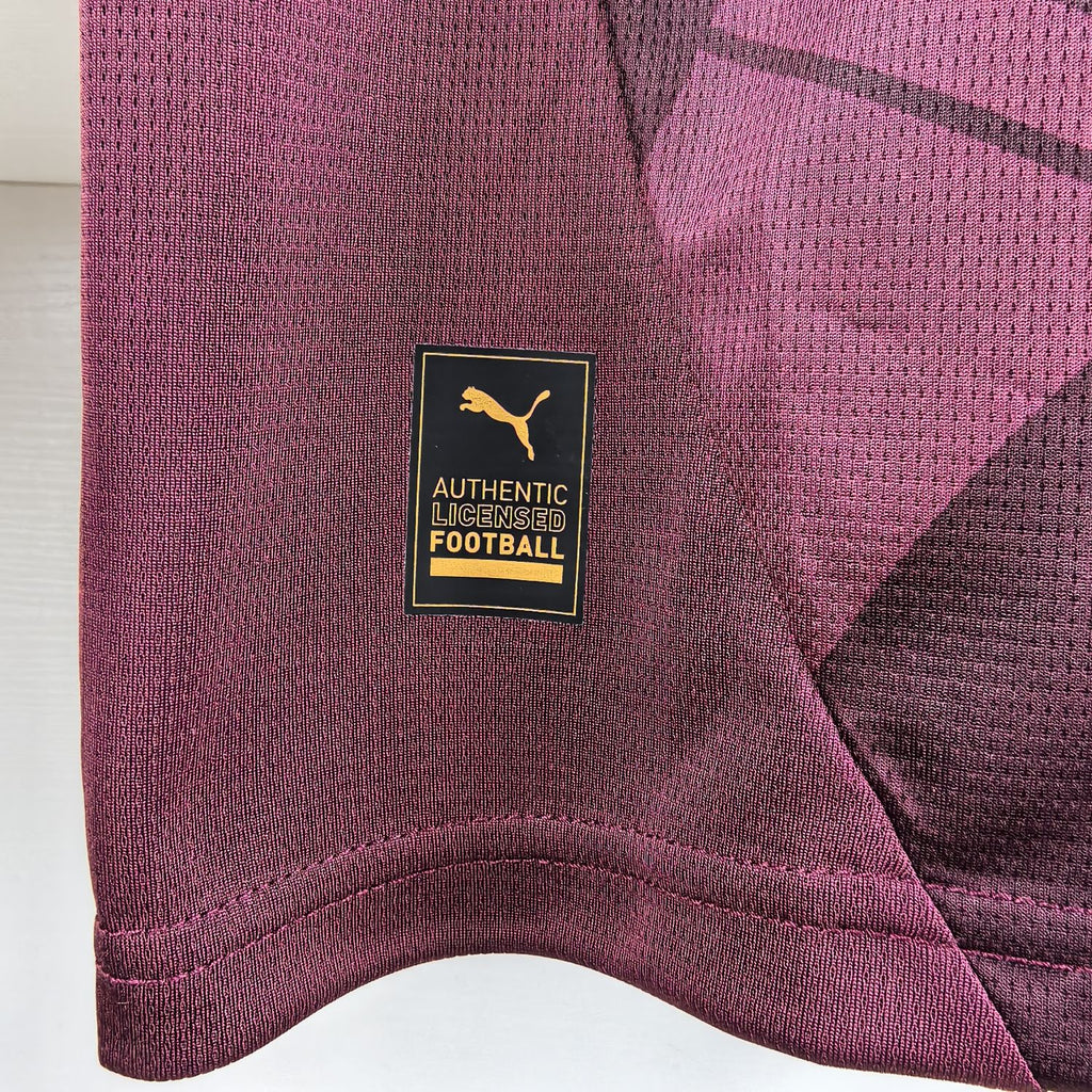 O uniforme inclui gola V e mangas bordôs, com o dourado presente nos logos da Puma, no escudo do clube e nos patrocinadores. Na Premier League, os nomes e números aparecem em branco, enquanto em competições europeias são dourados.