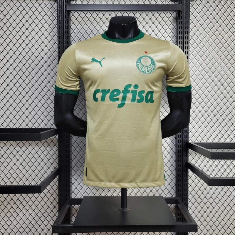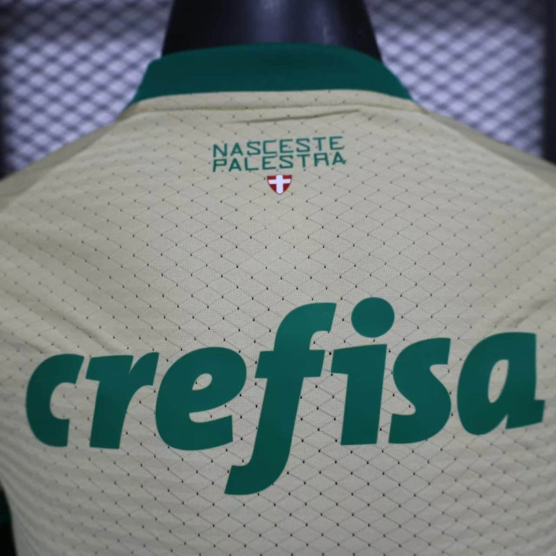 A nova terceira camisa do Palmeiras para a temporada 2024/25, desenvolvida pela Puma, celebra os 110 anos do clube com um design inédito na cor dourada. Detalhes em verde escuro adornam a gola e os punhos, enquanto a frase "Nasceste Palestra" está estampada na nuca, reforçando as raízes e a tradição do clube. Além disso, a parte frontal da camisa apresenta grafismos com a Cruz de Savóia, primeiro escudo utilizado pelo Palmeiras em 1916.