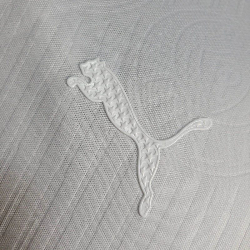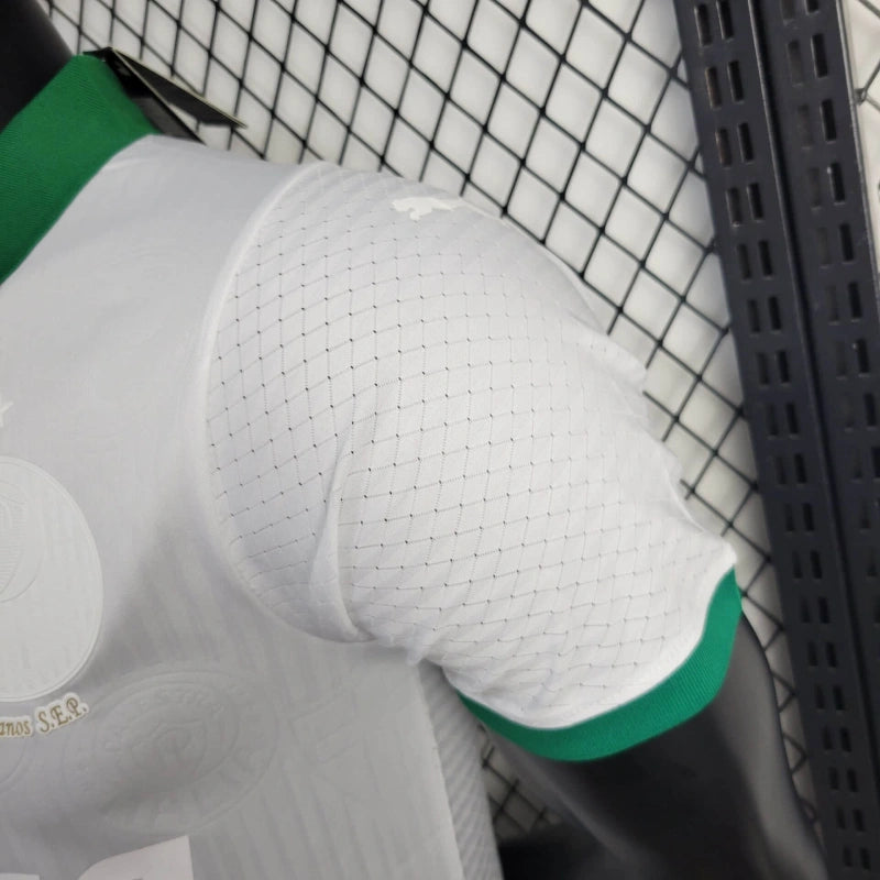 Vista-se com propósito e orgulho com a nova Camisa Especial do Palmeiras 2024, criada em parceria com a PUMA para a campanha #SomosSociedade. Este manto exclusivo é inteiramente branco, simbolizando a paz e a união, com detalhes sutis em verde na gola polo. O escudo do clube e os logos dos patrocinadores aparecem em estilo “whiteout”, destacando a mensagem de igualdade e respeito.