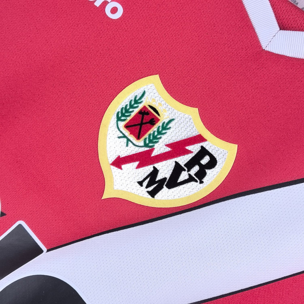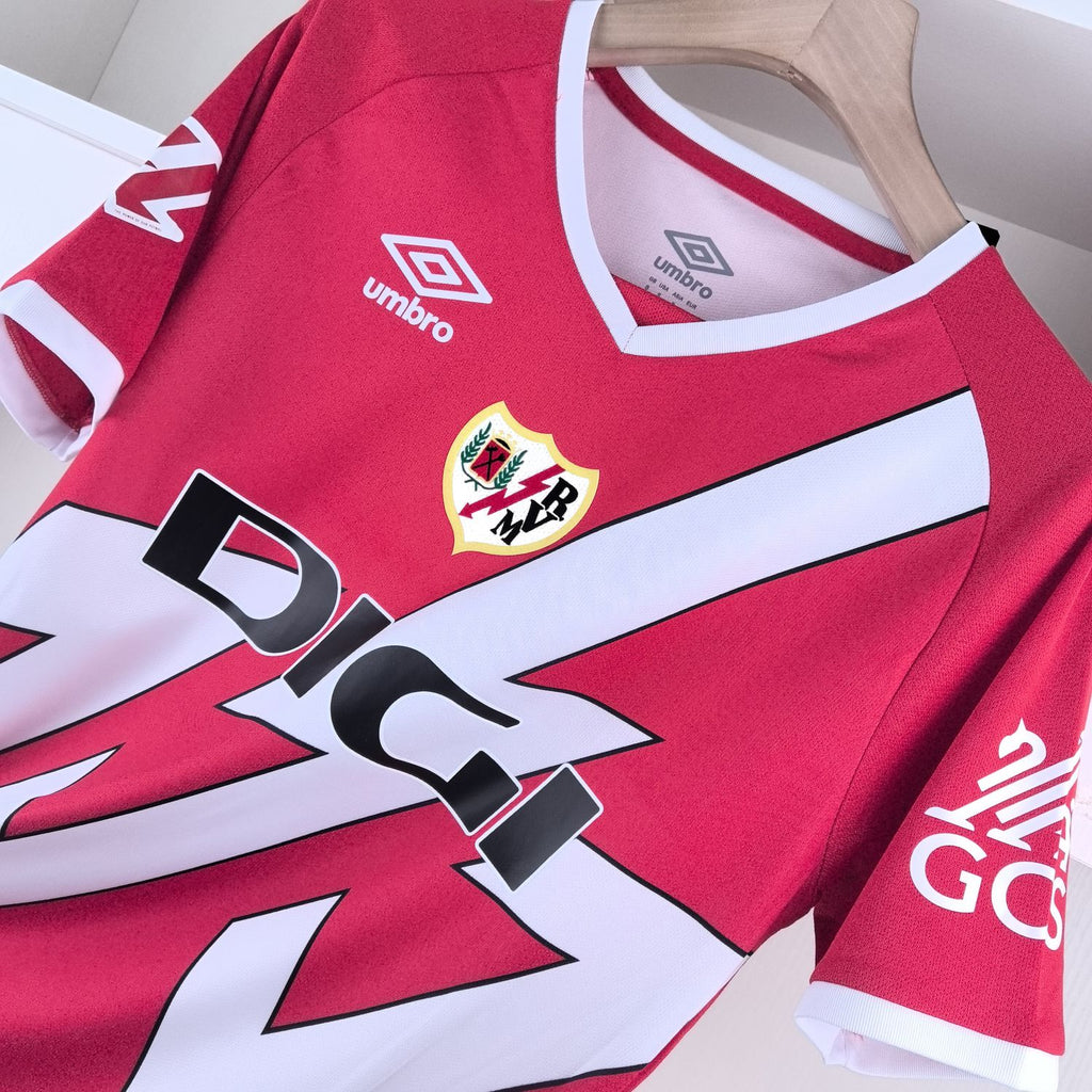 A camisa 2 do Rayo Vallecano para a temporada 2024/25 foi criada pela Umbro e se destaca pelo design em vermelho com gola V e punhos brancos. Ela apresenta o icônico raio em branco com bordas pretas na parte frontal, mantendo a identidade visual do clube. O escudo está centralizado, assim como o logo da Umbro em branco. Este uniforme é completado por calções e meiões vermelhos para jogos fora de casa.