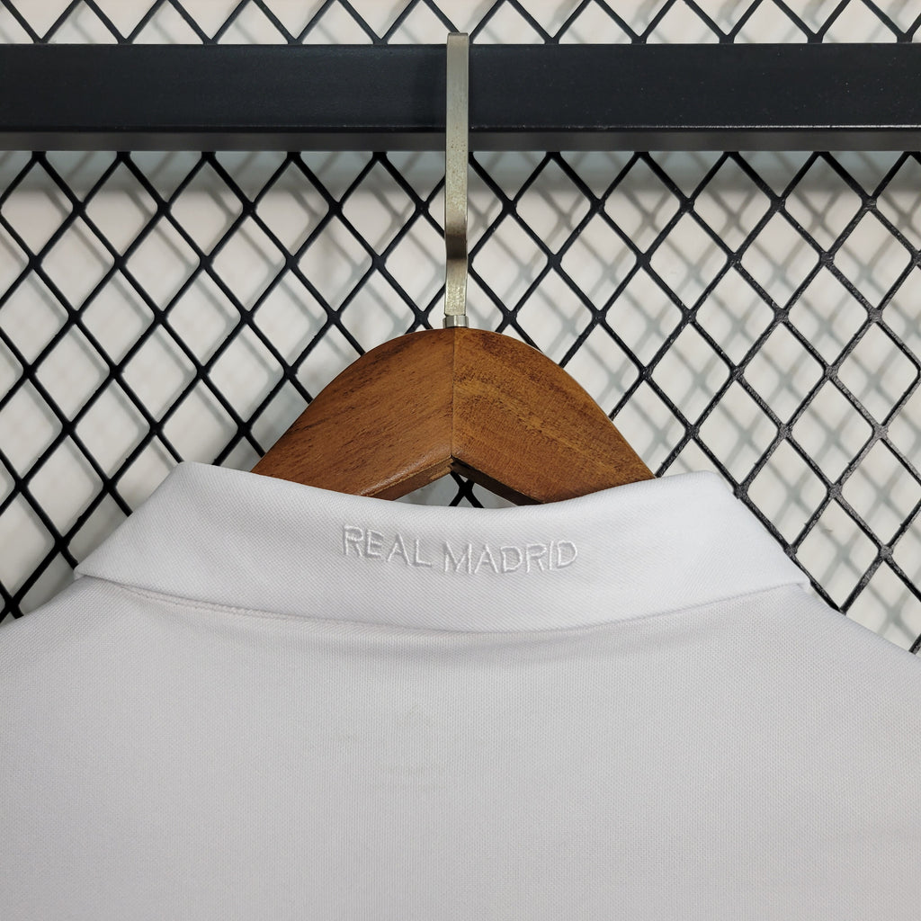 Essa camisa icônica marcou uma temporada histórica para os Merengues, com a conquista da La Liga e a 12ª taça da UEFA Champions League. Com seu design clássico branco, detalhes em roxo e o emblemático escudo do clube, essa peça é perfeita para mostrar sua paixão pelo Real Madrid e sua história gloriosa.