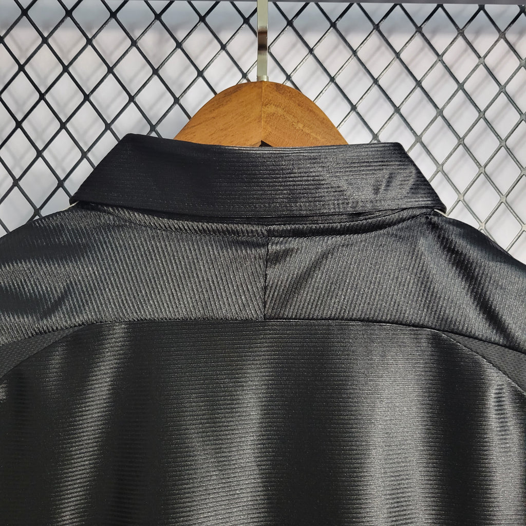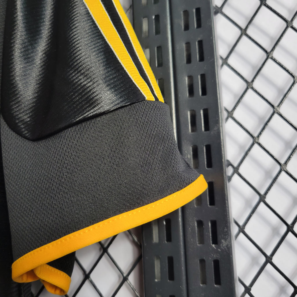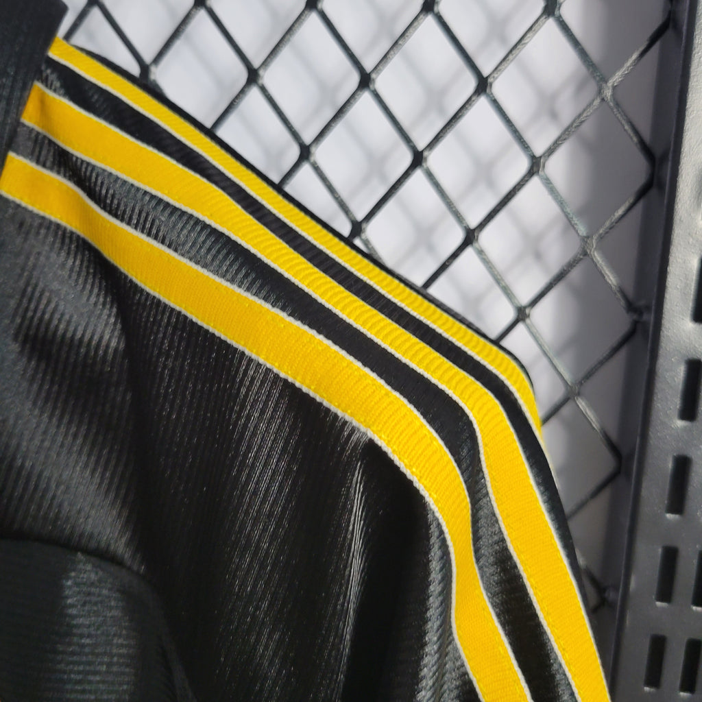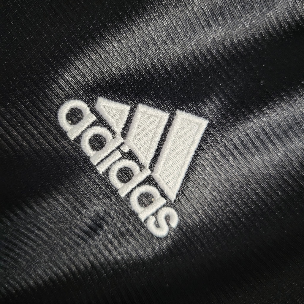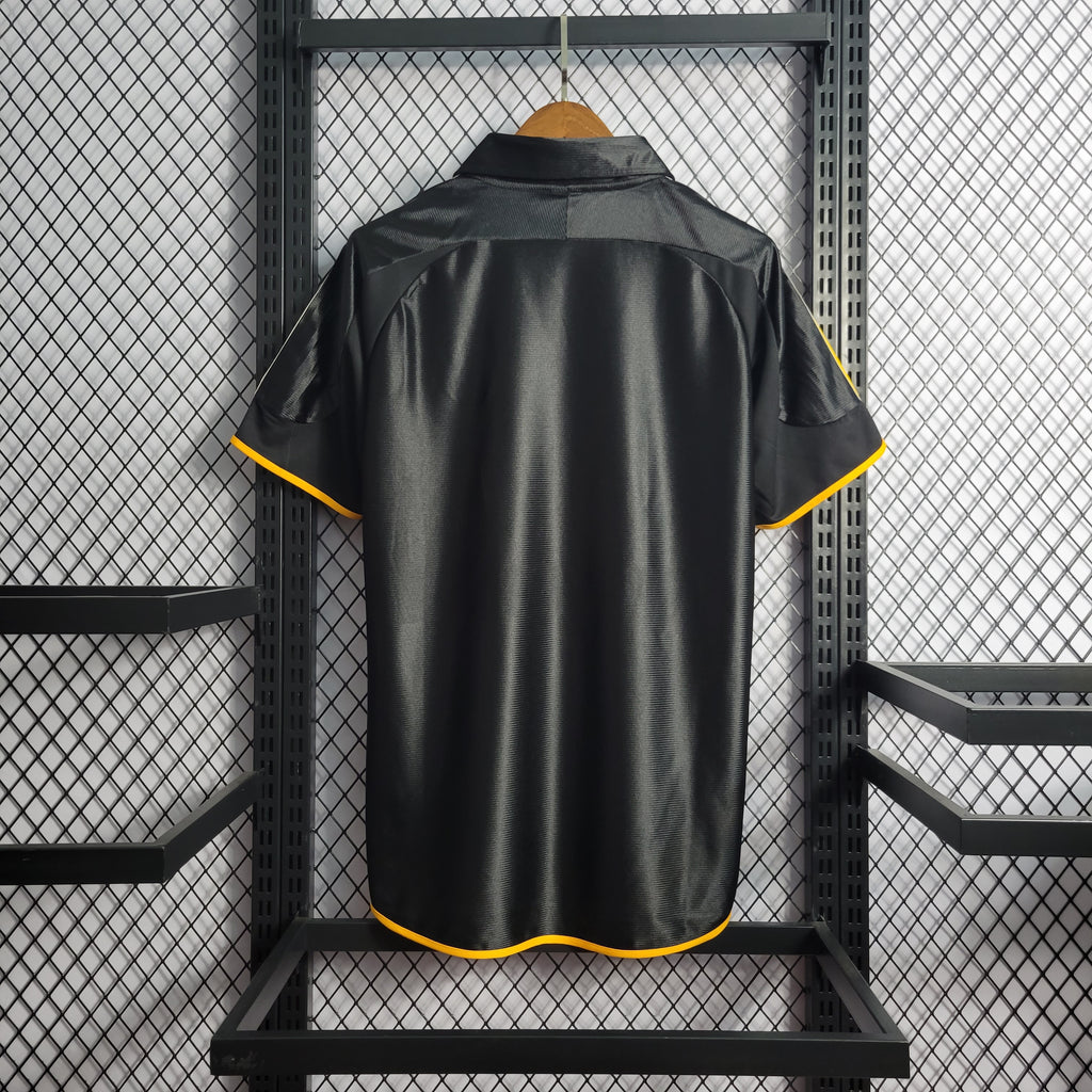 A camisa reserva do Real Madrid na temporada 1999/2000 é uma peça icônica que marcou uma era de sucesso para o clube. Desenvolvida pela Adidas, a camisa apresenta um design elegante na cor preta, com detalhes em branco e amarelo, refletindo a sofisticação e a tradição do time madrilenho. Esta camisa é especialmente lembrada por ter sido utilizada em partidas memoráveis, incluindo a final da UEFA Champions League contra o Valencia, onde o Real Madrid conquistou o título europeu.