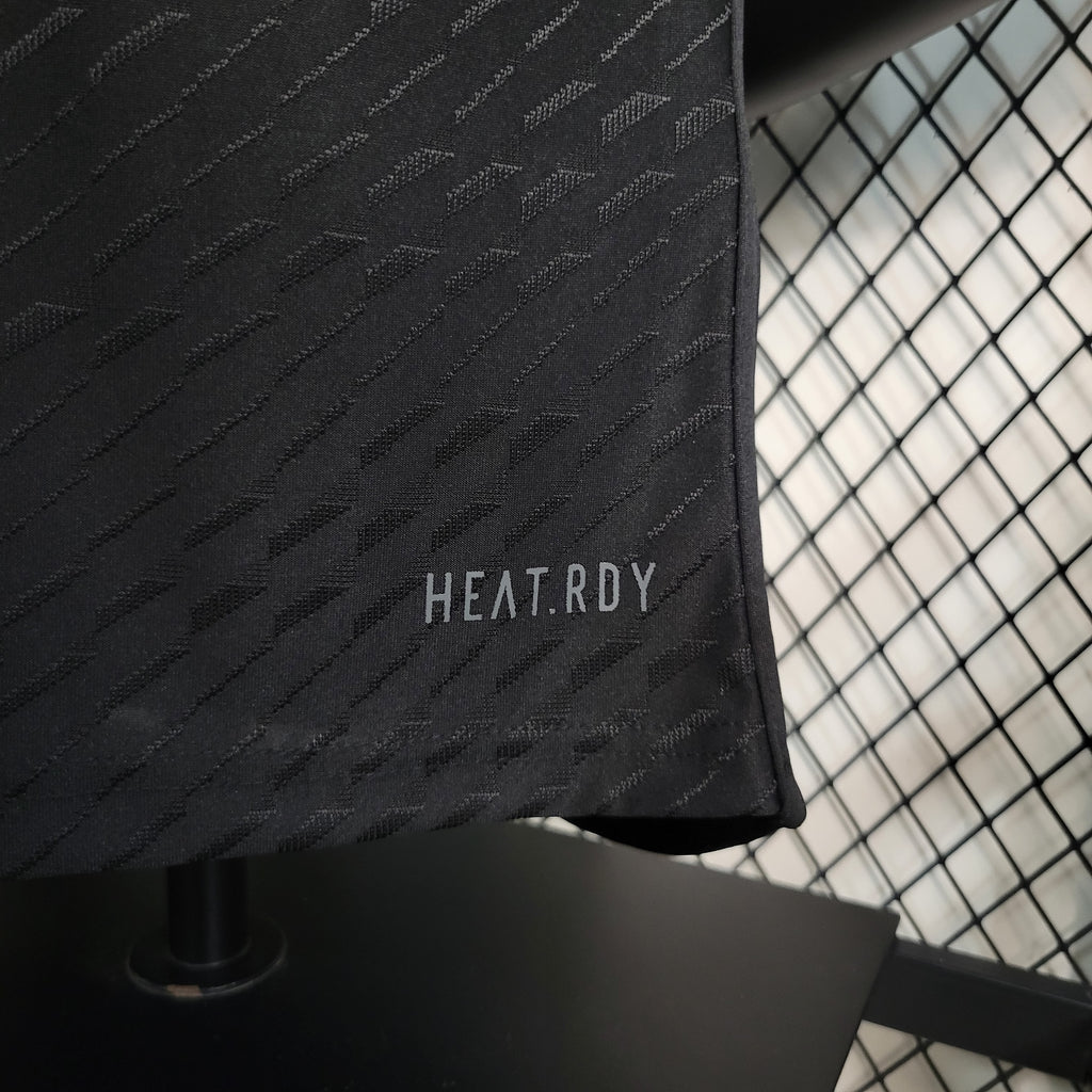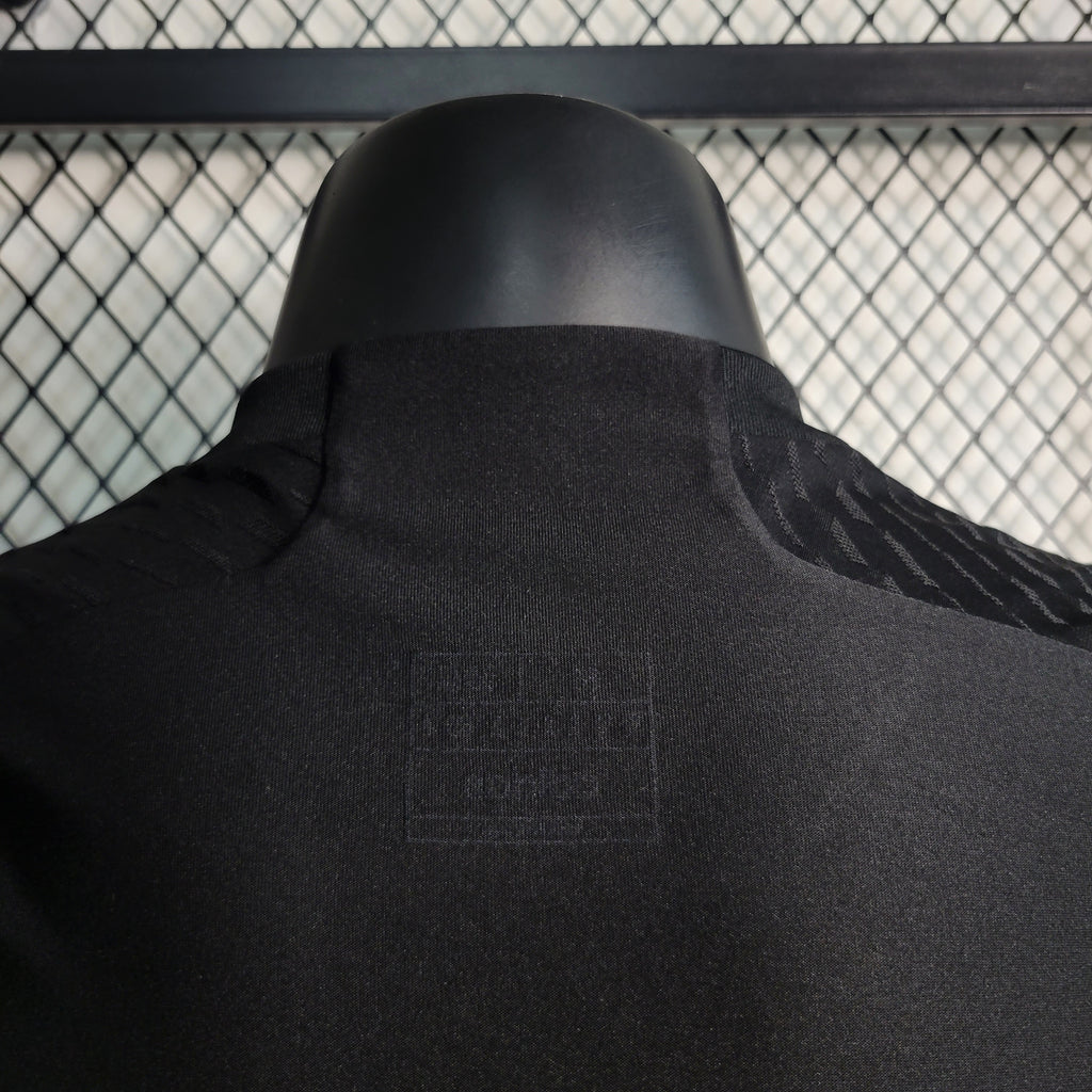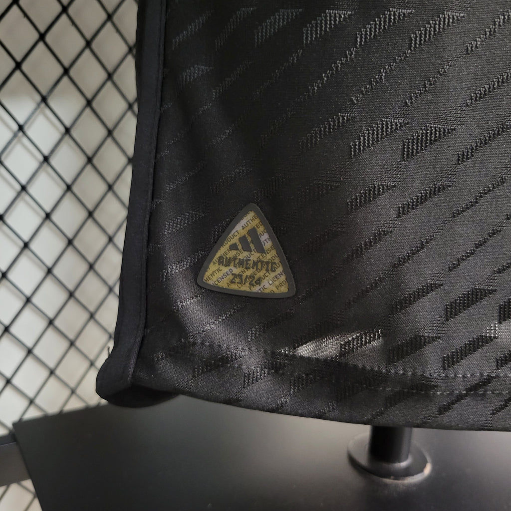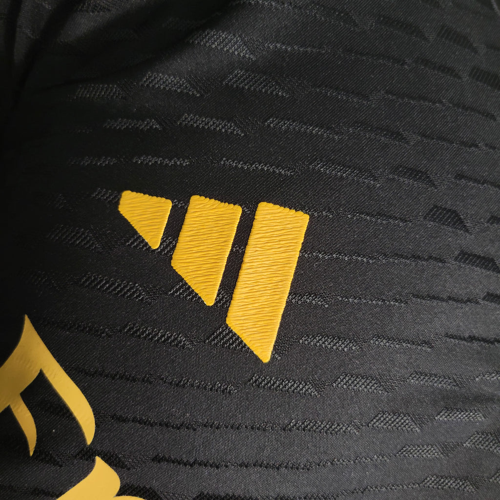 A Camisa 3 do Real Madrid para a temporada 2023/24 apresenta um design predominantemente preto, homenageando os uniformes alternativos históricos do clube. Detalhes em amarelo, incluindo as iniciais "RMCF" bordadas no lado interno da gola, adicionam um toque de elegância ao manto. A versão Jogador desta camisa é confeccionada com materiais de alta performance, proporcionando leveza e respirabilidade superiores. O ajuste é mais justo ao corpo, visando otimizar o desempenho dos atletas em campo. Tecnologias avançadas, como a HEAT.RDY, são incorporadas para manter os jogadores frescos durante as partidas.
