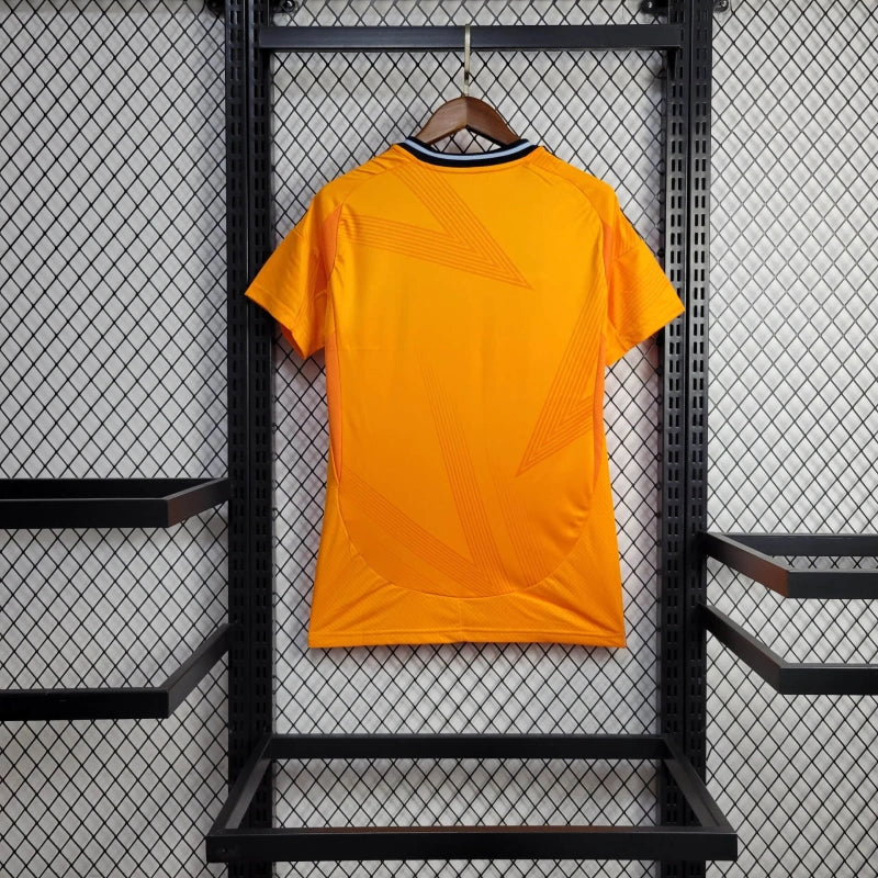 A Camisa 2 do Real Madrid Feminina para a temporada 2024/25 apresenta um design vibrante e moderno, destacando-se pela sua cor laranja intensa. O modelo é adornado com detalhes em azul-escuro, incluindo o escudo do clube no peito e as icônicas três listras da Adidas nos ombros. A estampa abstrata inspirada em estrelas adiciona um toque único à peça.
