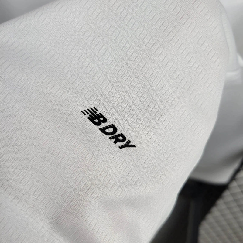 A Camisa Manga Longa São Paulo Masculina Home, com design predominantemente branco, traz grafismo com a frase 'Sentimento que Jamais Acabará' na parte interna do escudo e as cores do Tricolor na parte frontal da peça. O modelo é produzido em poliéster e também conta com tecnologia NB DRY para absorção de suor, proteção UV e ação antibacteriana.