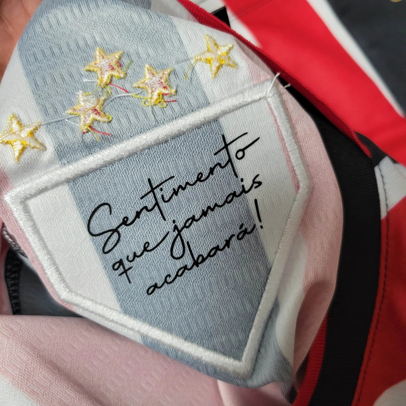 A Camisa II do São Paulo para a temporada 2024/25, desenvolvida pela New Balance, presta homenagem aos 94 anos de história do clube e destaca a importância da formação de atletas em Cotia. O design apresenta as tradicionais listras verticais em vermelho, preto e branco, com gola em V e mangas listradas. Detalhes especiais incluem a inscrição "A História Começa Aqui" na parte traseira, simbolizando novos capítulos na trajetória do Tricolor, e o selo "Made in Cotia: atletas e cidadãos" na barra, reconhecendo a base formadora do clube. Além disso, a frase "Sentimento que jamais acabará" está estampada internamente, atrás do escudo bordado, reforçando a paixão eterna dos torcedores pelo São Paulo FC.
