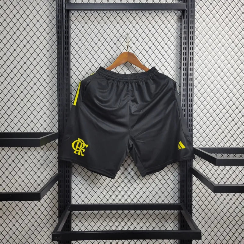 Bermuda de Treino do Flamengo 2023/24, uma peça oficial projetada para treinos e atividades físicas. Com o escudo clássico do Flamengo em destaque na cor amarela, combinado com o logotipo da Adidas, a bermuda oferece um design moderno e funcional.