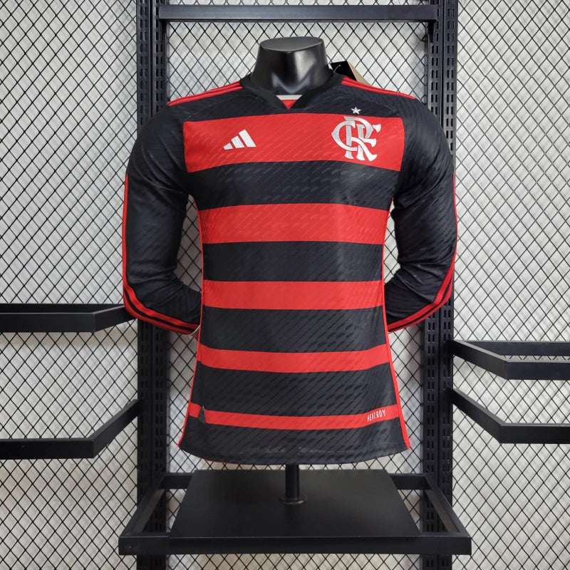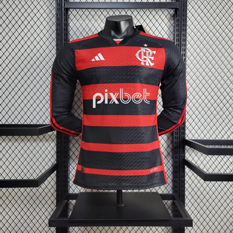 A Camisa 1 do Flamengo para a temporada 2024/2025, modelo Jogador, é a mesma utilizada pelos atletas em campo. Desenvolvida pela Adidas, apresenta as tradicionais listras horizontais em vermelho e preto, com um design moderno que incorpora grafismos inspirados no movimento das arquibancadas e do campo. O escudo do Flamengo e as Três Listras da Adidas são aplicados por termotransferência, resultando em uma peça mais leve e com menor resistência ao vento.