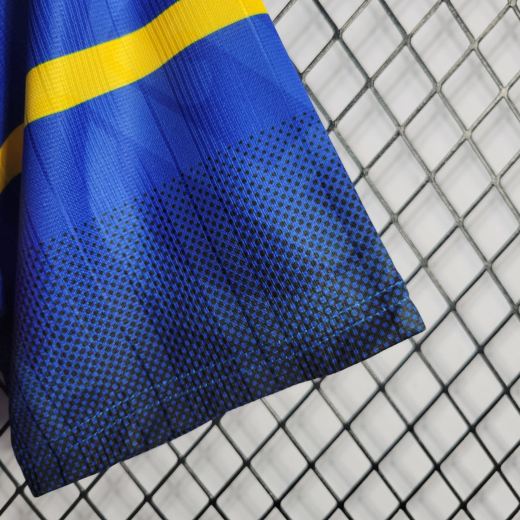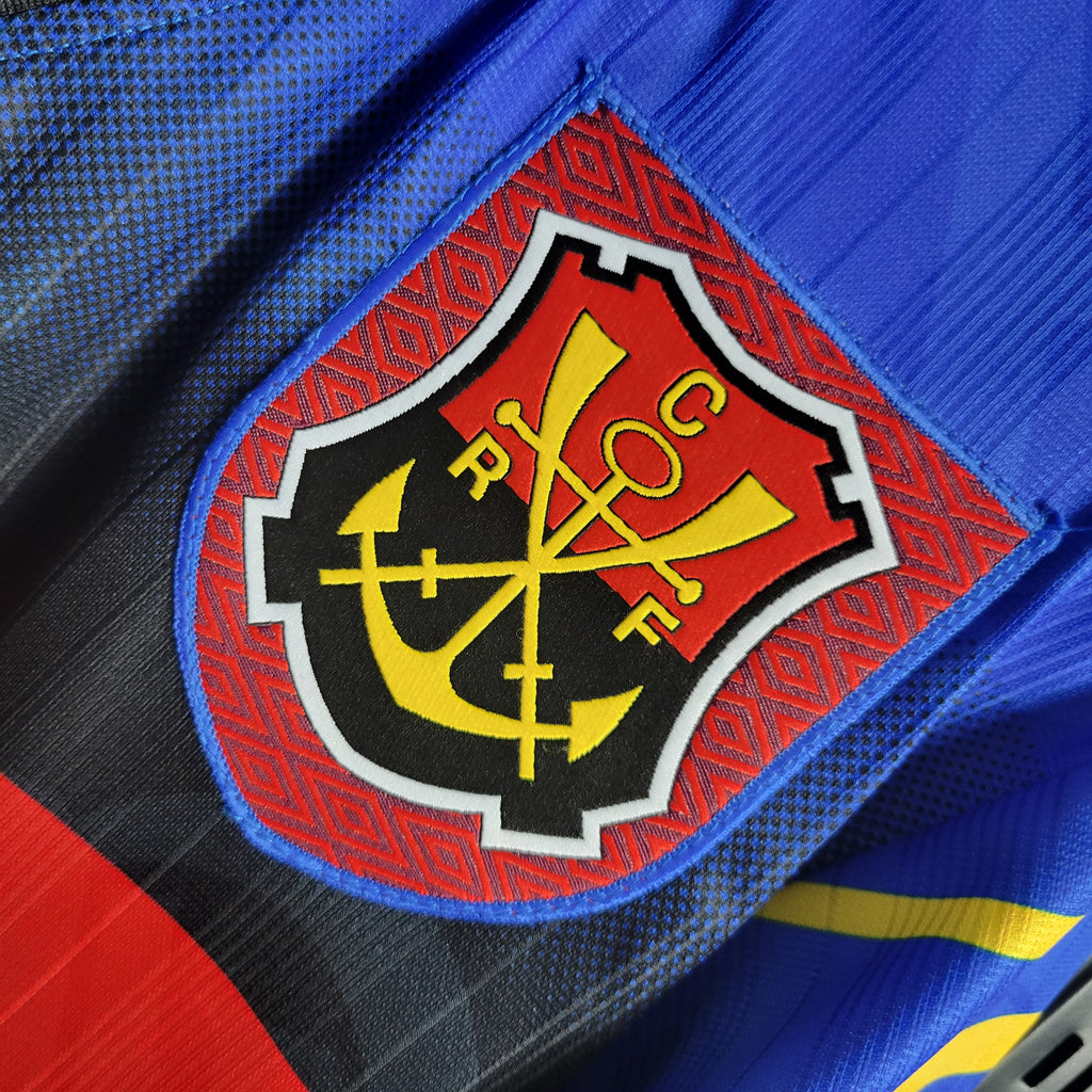 Essa é a Camisa 3 do Flamengo, modelo retrô de 1995, uma das mais icônicas e raras da história do clube. O design inovador traz uma base predominantemente azul, com detalhes em vermelho, amarelo e preto. Esse uniforme foi desenvolvido pela Umbro e possui o patrocínio da Lubrax e Petrobrás, estampados no centro, além do escudo tradicional do Flamengo em destaque no peito.