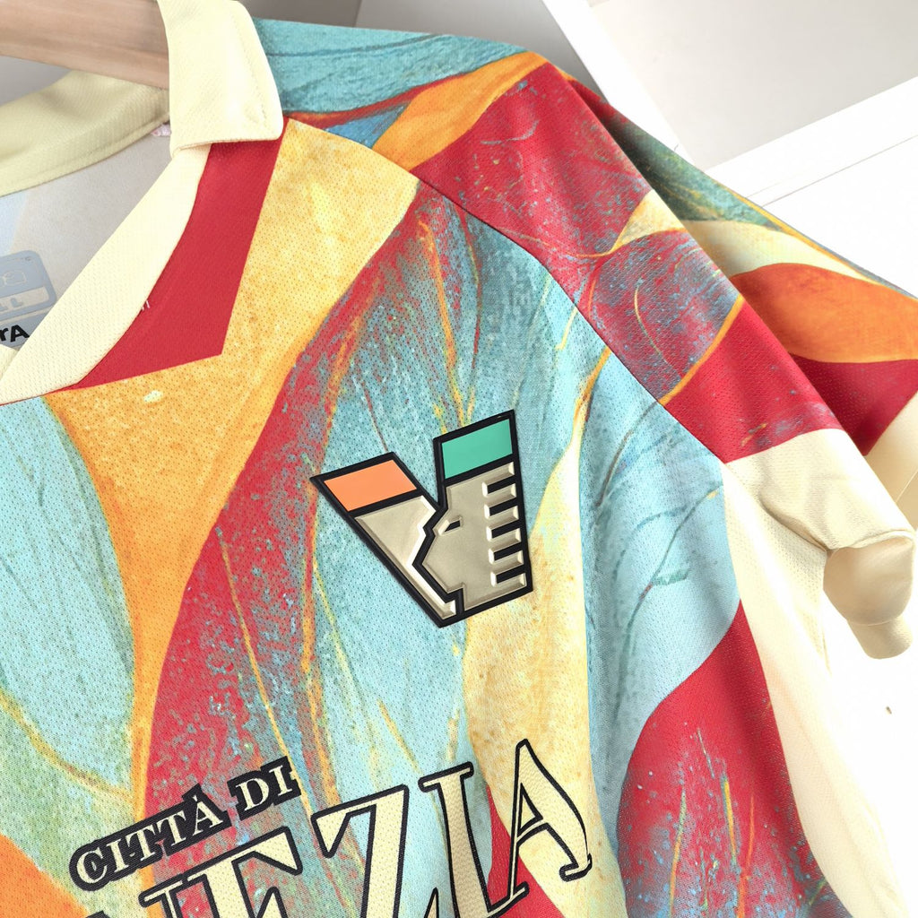 Esta camisa de edição especial do Venezia é uma verdadeira obra de arte. Com um design abstrato e cores vibrantes, ela se destaca entre as demais. O fundo branco da camisa realça os tons de vermelho, laranja, azul e cinza que compõem o padrão. No centro, em letras brancas ousadas, está o nome “VENEZIA”, com um efeito de contorno que lhe confere destaque. Logo acima do texto, encontramos um pequeno emblema que lembra um leão alado, uma referência à cidade de Veneza. Na área do peito direito, há outro emblema estilizado em dourado, com um desenho que parece asas. Detalhes em dourado também adornam a gola e as bordas das mangas, complementando o tema artístico da camisa. Esta peça exclusiva é um item de colecionador para os fãs do Venezia em 2024.