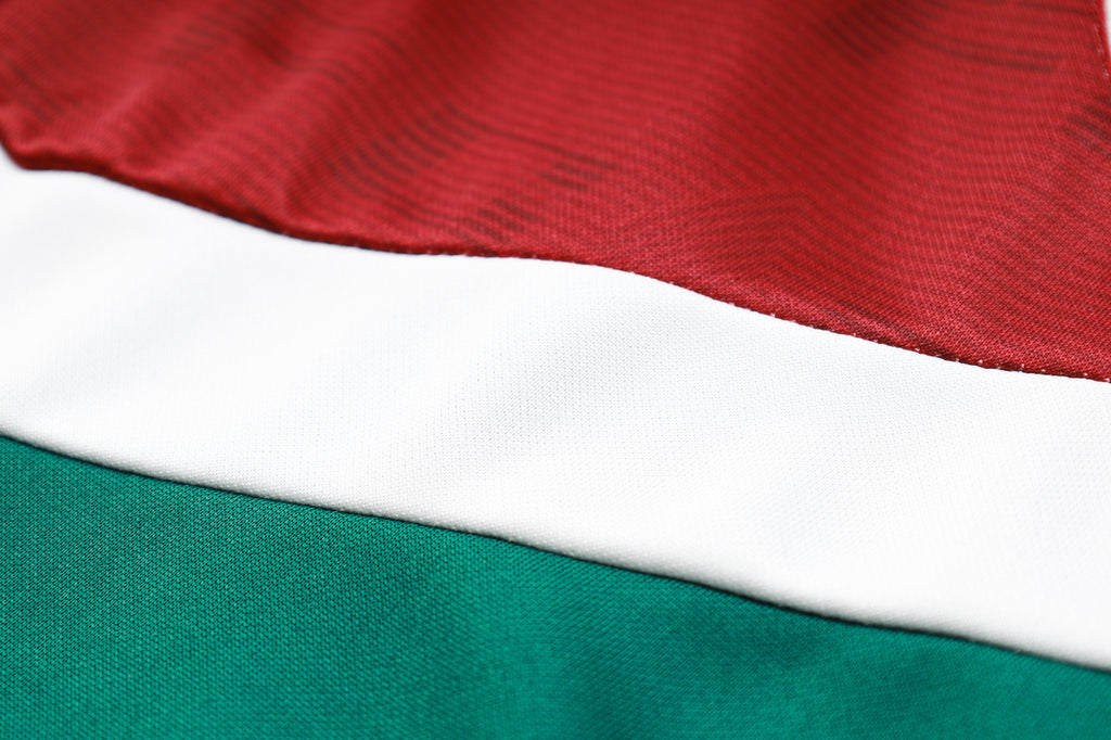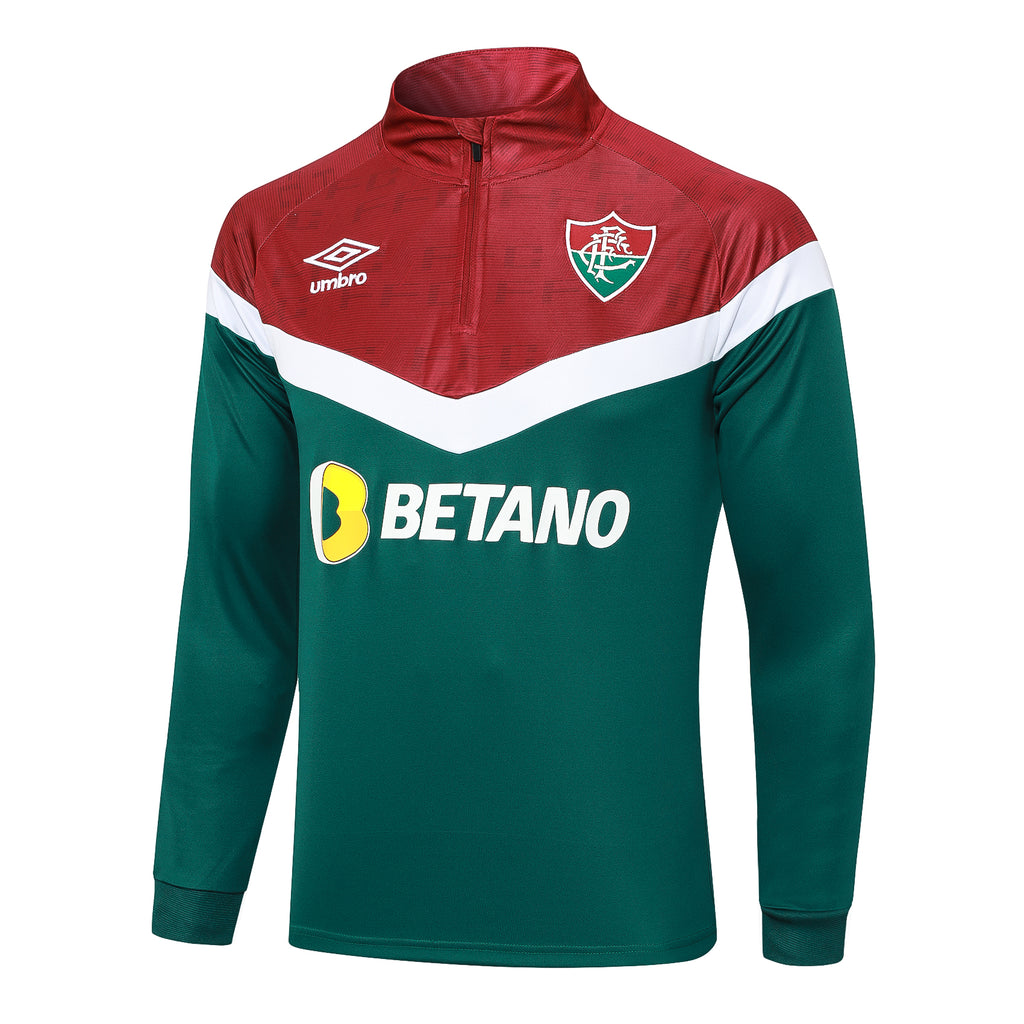O Agasalho de Treino do Fluminense 2023/24 é uma peça do clube carioca, desenhada para proporcionar conforto e estilo tanto nos treinos quanto no uso casual. Este agasalho apresenta um fecho frontal de quarto de zíper (quarter zip) que permite fácil ajuste de ventilação e conforto térmico. Ele é fabricado com materiais leves e respiráveis, favorecendo a liberdade de movimento, essencial para a prática desportiva. O design sem bolsos mantém uma aparência limpa e minimalista, enquanto o escudo do Fluminense está estampado no peito, destacando o orgulho tricolor.